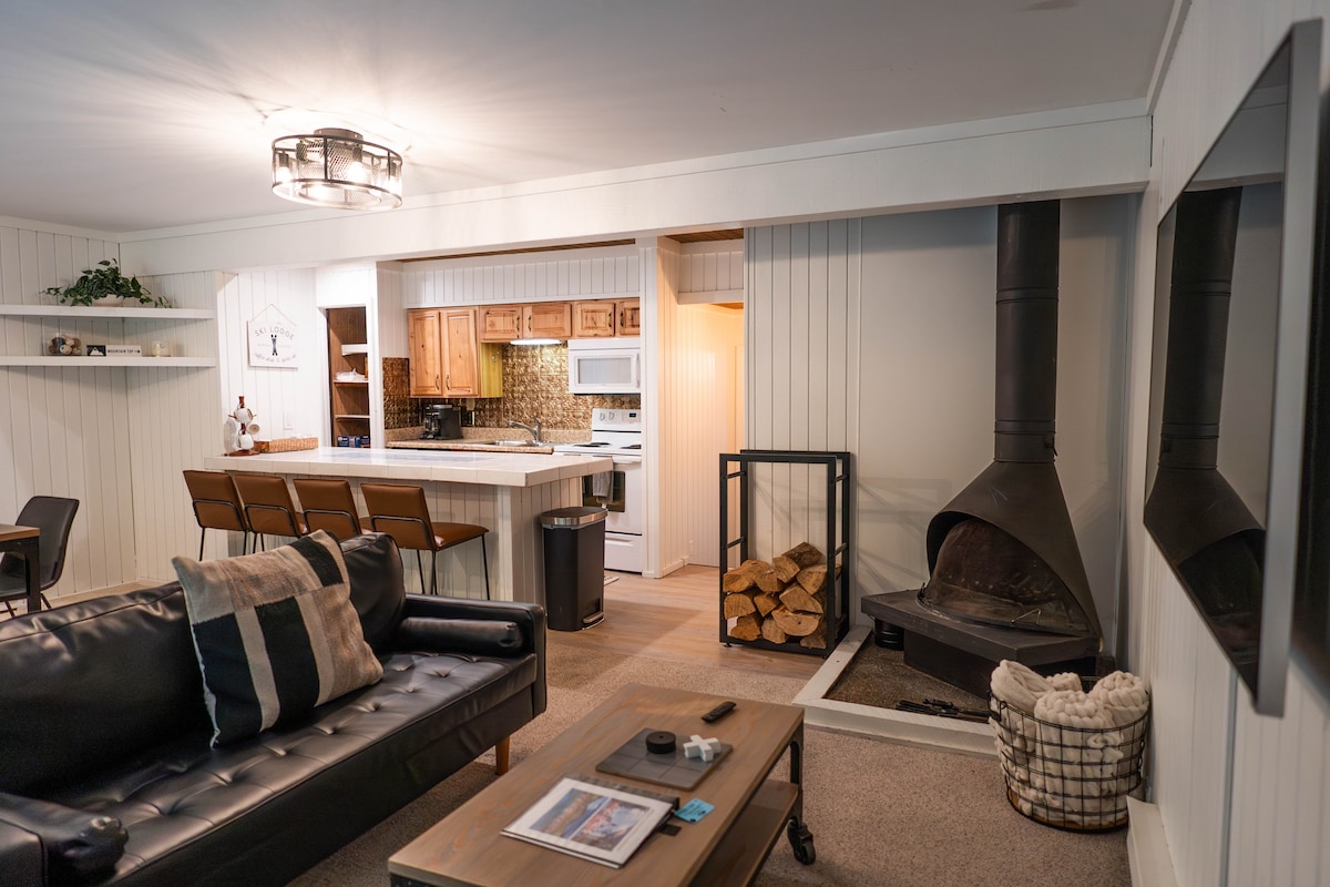 This condo is an end unit which overlooks the Shanty Creek golf course and lake Bellaire. Enjoy modern décor, leather couches, a fully stocked kitchen (fridge, stove, oven, dishwasher, coffee maker, hot water heater, microwave and toaster), all TVs are Amazon Fire so login to your prime account, and you’ll have access to Netflix, Youtube, Disney+ or any other streaming service you subscribe to. Snuggle up next to a wood fireplace (firewood available for purchase at Family Fare or local farms).