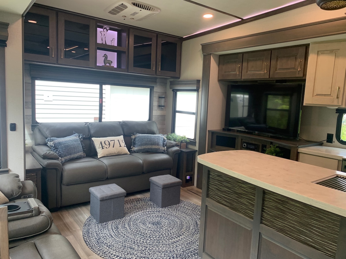 2021 Alliance 340RL 5th wheel with plenty of room for cooking, dining, and sleeping. King size bed, plus fold out sofa. Huge walk-in shower. Heat - furnace and fireplace. A/C - 3 A/C units (can currently run only 2 at a time but plenty cool). All cooking necessities, utensils, plates, glasses, etc. Keurig coffee station. Large residential refrigerator. Enjoy a quiet night by the fire outside with a solo stove. Camper is only available on property. Please no children, no pets.