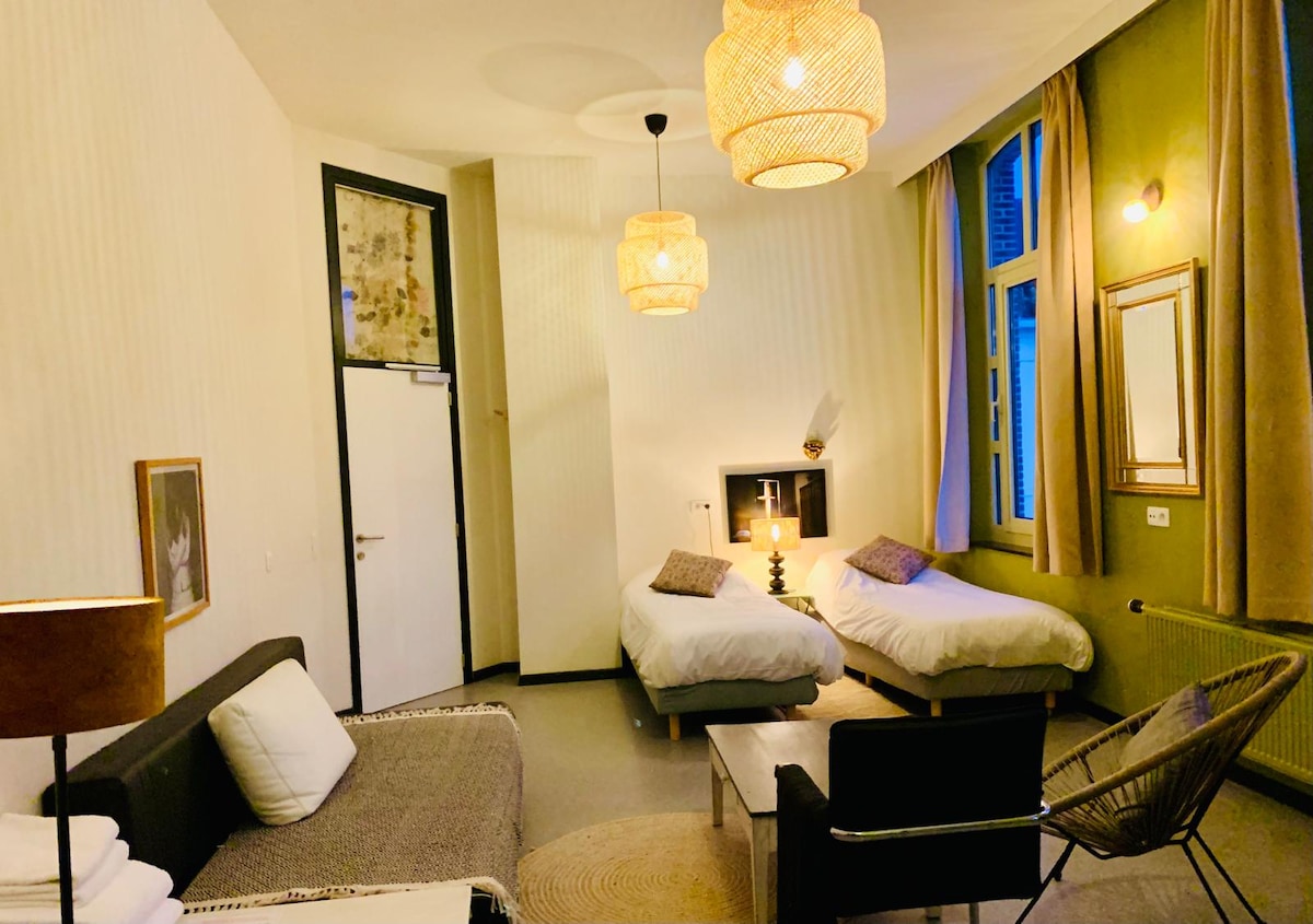 Je wordt opgevangen in een gerenoveerd herenhuis dat dateert van 1891. Je slaapt in een ruime kamer met balkon, op de eerste verdieping. De badkamer bevindt zich op de tussenverdieping: er is een bad, een douche , toilet, 2 lavabo's , strijkgelegenheid...Op aanvraag kan je uitgebreid ontbijten met de lekkerste producten...Voor slechts 10 euro extra per persoon ! In deze artistieke buurt vind je heel wat gezellige restaurantjes en cafeetjes met zowel wereldkeuken als lokale proeverijen ! Welkom !