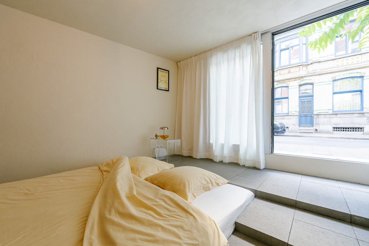 Ontspan en kom tot rust in deze serene, stijlvolle guest suite. De ruimte ademt rust en eenvoud, met een minimalistisch design, zachte kleuren en uitzicht op een groene patio. Er is een koelkast en de mogelijkheid om koffie of thee te zetten. De suite beschikt over een eigen badkamer en een kleine buitenruimte om te genieten van de stilte. Gelegen vlak bij het Zuid en op slechts een kwartiertje wandelen van het stadscentrum — perfect voor wie houdt van licht, rust en tijdloos design.