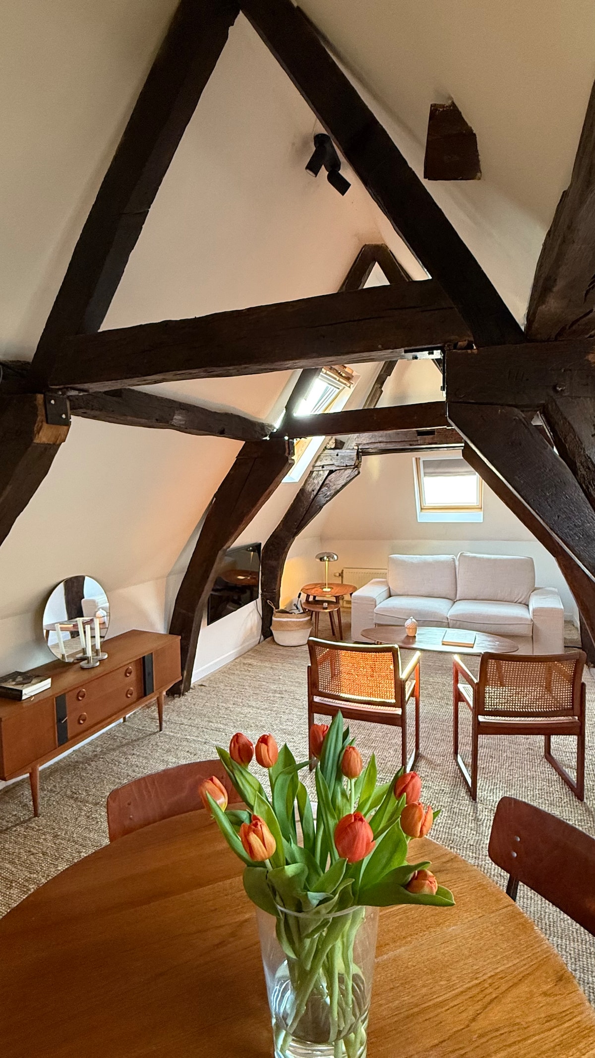 Welcome to this charming apartment on the 2nd floor of an authentic house. It is spread over two levels and connected by a shared staircase. The layout divides your private bedroom and bathroom on one side and your private living room and kitchen on the other. Located on the second oldest street in Antwerp, this neighbourhood is surrounded by green parks. Thanks to excellent public transport connections and a shared bike station, you are just 15 minutes from the centre.
