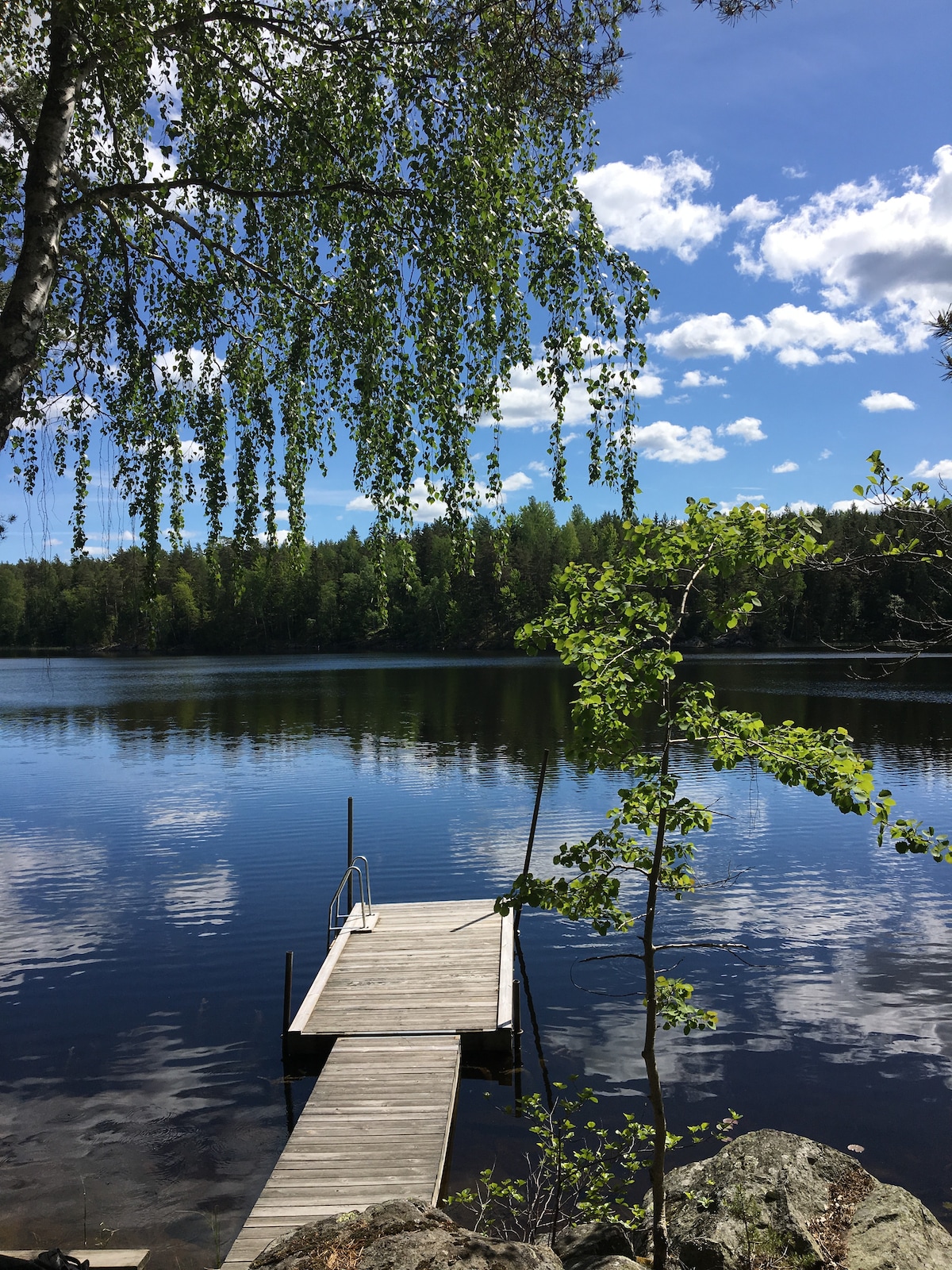 Rent our cozy cabin - a year-around pearl. Enjoy your breakfast on the glassed veranda, keeping a lookout for deer passing by. Go mushroom hunting in the thick Swedish forest just outside your door. Bring your coffee to the lake just below the house - if you're lucky you might catch a glimpse of the lake's own beaver. Wrap your day up with dinner and wine in the spacious kitchen, before you crash on the couch, slumbering to the crackling sounds of the fireplace.
