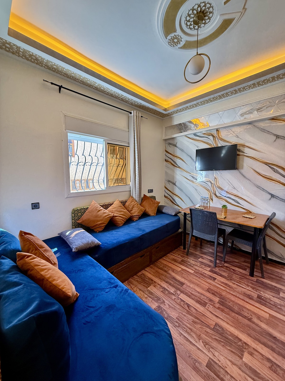 Vivez la simplicité et la commodité dans notre appartement proche des plages. Cet appartement neuf, spacieux et lumineux de deux chambres et séjour 74m présente un design moderne et minimaliste, vous assurant de profiter au max de votre séjour. Situé dans un quartier calme, au sein d'une résidence sécurisée de moyen standing, il se trouve à seulement 5 minutes de la Marina d'Agadir et à 10 minutes de Taghazout. La plage la plus proche est à seulement 400 mètres, accessible à pied ou en voiture.