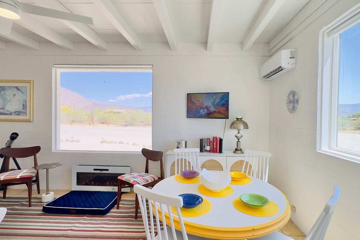 This renovated mid-century-modern desert retreat awaits with premium king size bed, luxury all cotton bedding, towels, robes and a well-equipped kitchen to comfort weary travelers. Close to town (1/2 mile) with shops, restaurants, golf courses, pools, tennis courts, & hiking just moments away. Explore the night sky in this registered Dark Sky Community with provided telescope, off-road adventure in the Anza-Borrego State Park, hike local trails, or just take in the surrounding mountain scenery.