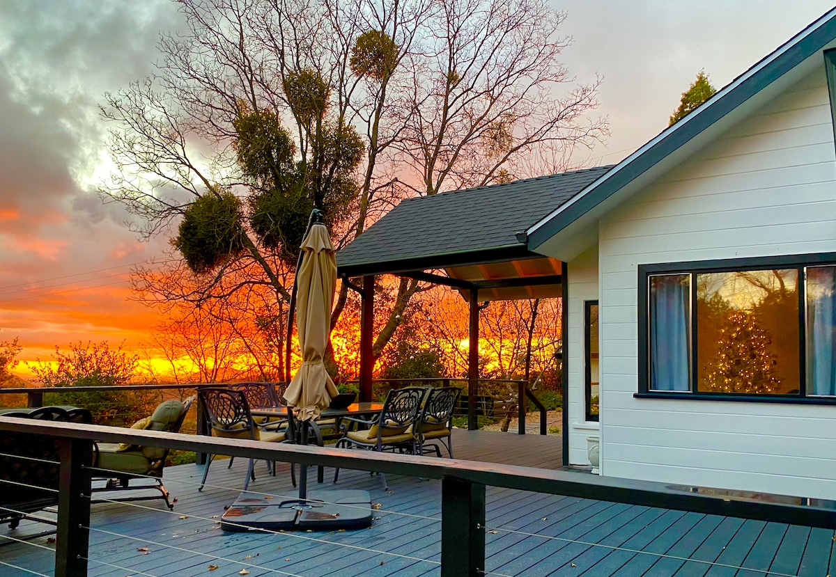 Experience all four seasons from this peaceful hillside guesthouse, where expansive views and quiet mornings set the pace. Sip your coffee on the private redwood deck, enjoy meals outdoors, and unwind in the rocking chairs as the sun rises and sets over the hills. This cozy retreat is designed for rest, reflection, and simple moments that linger long after your stay. Designed for two adults only or solo travelers.