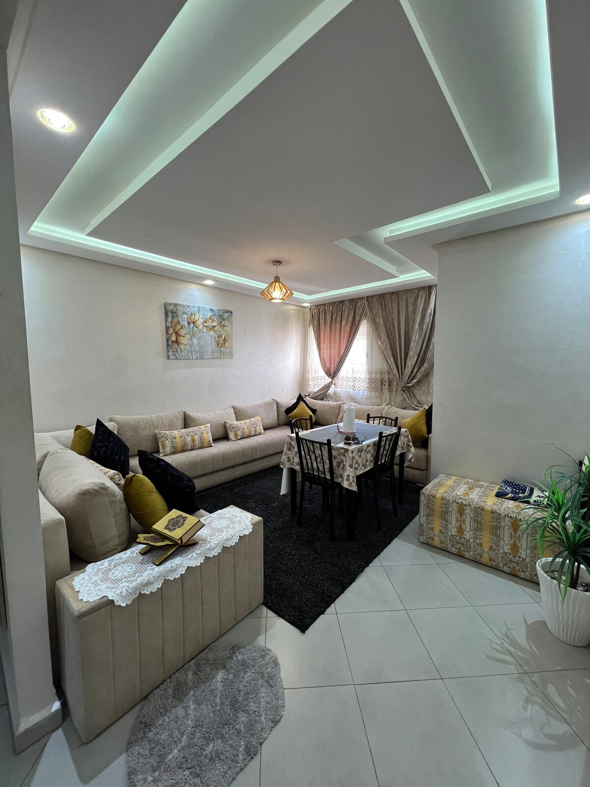 Bienvenue dans notre appartement lumineux et spacieux idéalement situé au rez de chaussée d’un immeuble dans un quartier animé au Cœur d’agadir À quelques pas des meilleures attractions, -restaurants café Et des supérette - transport en commun - Supermarché et pharmacie à proximité, plage à 12 min Idéal pour les couples les familles ou les voyageurs d’affaires ; un petit geste pour vous faire sentir les bienvenus ! Nous offrons une corbeille de fruits frais et des bouteilles d’eau gratuitement