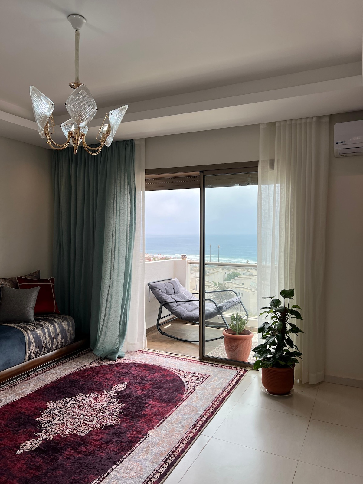 Vous êtes amateurs du surf de la plage et du beau temps? Notre appartement situé à Anza (10 min en voiture de la Marina d'Agadir) vous permettra de profiter d'un séjour exceptionnel avec une vue panoramique sur l'océan. Composé de deux chambres à coucher avec deux douches et un salon spacieux avec une climatisation dans toutes les pièces Aussi une cuisine entièrement équipée et un service de gardinage avec toute la sécurité demandée.