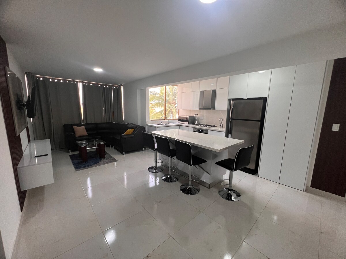 El apartamento cuenta con amplia entrada de luz natural, muebles cómodos y cada rincón distribuido para hacerte sentir en casa al instante en un ambiente acogedor donde el confort realmente te abraza. Este alojamiento tranquilo y céntrico está ubicado cerca de prestigiosos restaurantes a solo metros de la playa y cuenta con hermosas áreas verdes, una paradisiaca piscina en un entorno donde dispones de todo para relajarte, disfrutar y combinar la naturaleza con la comodidad.