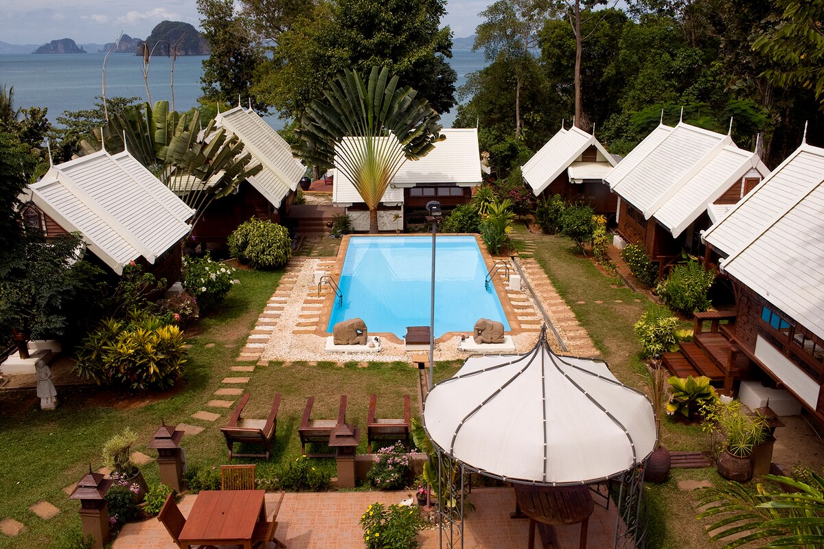 Profitez d’un espace intimiste noyé de verdure, les pieds quasiment dans l’eau, face à la magnifique baie de Phangna. Cette chambre pour 1 personne dispose d’un climatiseur, d’un balcon et de sa propre salle de bain (petit-déjeuner inclus). Les 9 bungalows de la propriété peuvent accueillir 23 personnes. L’endroit rêvé pour un atelier, un séminaire dépaysant, une réunion de famille, un événement à fêter. Pour plus de chambres ou pour privatiser l’endroit, contactez-moi.