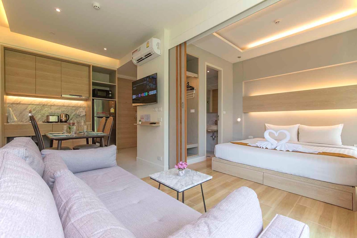 A stylish apartment, centrally-located apartment located on the 6th floor of Ao Nang's premier complex, Rocco Ao Nang. The 35 sq.m apartment is lavishly equipped with everything you would need for a comfortable stay. Walking distance to the beaches (5 mins), boat piers, and all restaurants and bars. Guests are free to use the onsite gymnasium, swimming pool and sauna. Onsite parking for bikes and cars.t this peaceful and centrally-located place.