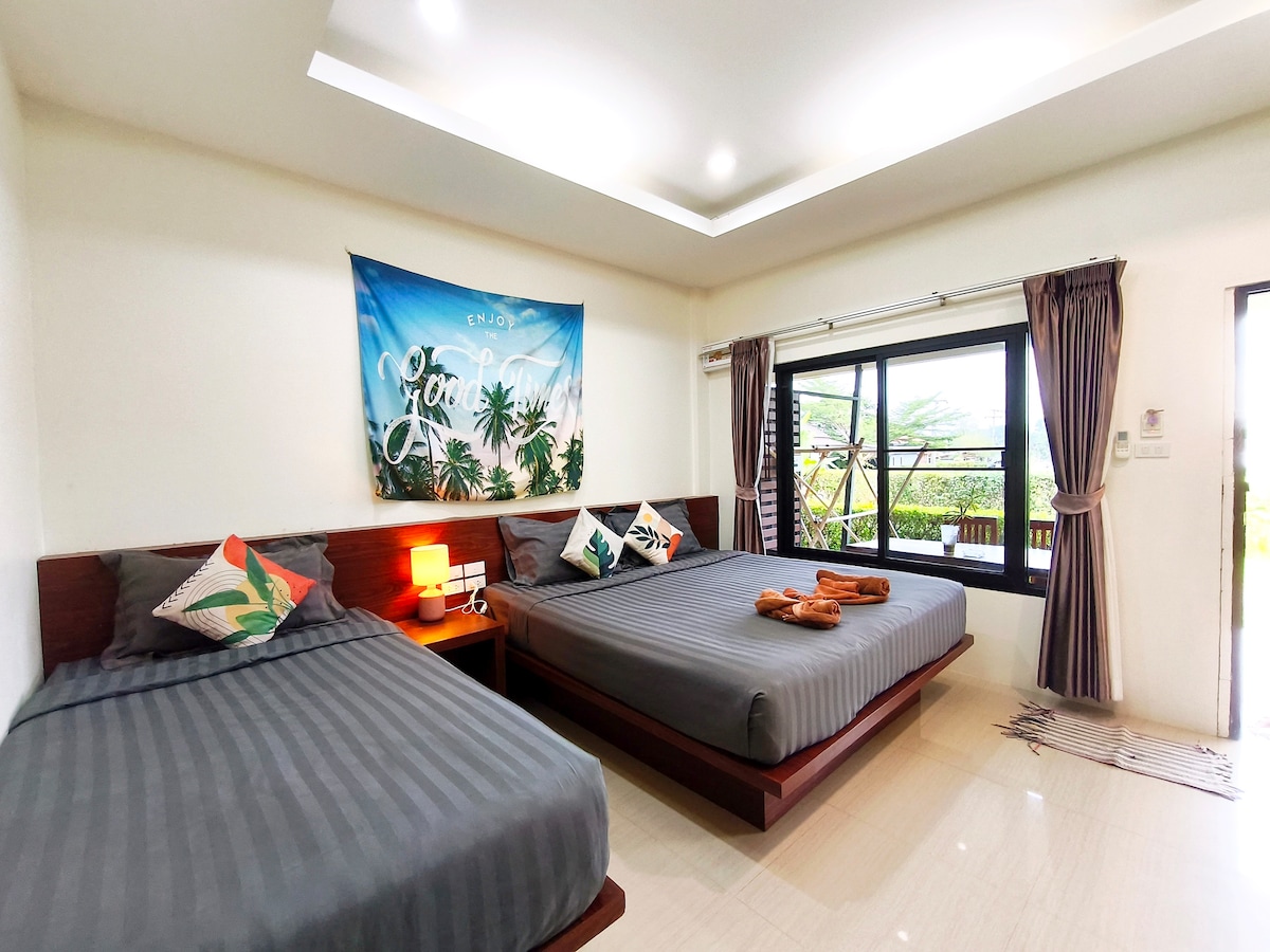 Peacefully stay in the local area of Soi Khao Kaeo 1,Aonang. Baan Narapas surrounded by greenery garden🌿🌴🌵. Whole unit , a bedroom 🛏️ with 1King bed and 1single bed, bathroom with hot shower🚿and amenities 🧻🧴, kitchen with necessary kitchenware 🍳🍽️🧂, and relaxing area with dining table at the terrace 🪑🪴 10 mins to Makro Supermarket by walk and 10 mins away from Aonang Beach🏖️ by motorbike. We provide drinking water, instant coffee and tea set, bathroom amenities and towels for your convenience