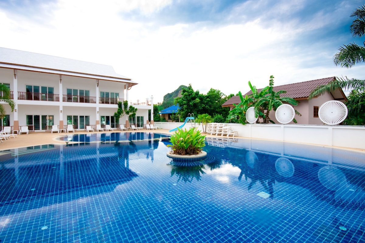 Your Second Home in Thailand Ao Nang Krabi Air conditioned room Free Wireless Swimming pool Modern Kitchen Free beach transport Motorbikes or car for rent 2.30 km. from Ao Nang A very beautiful well-kept and quite studio in the tropical Jungle Village Resort, Ao Nang, within 5 minutes to Ao Nang beach on a scooter or by free Tuk-Tuk service. You have a perfect view to the pool and rain forest mountain and just under 10 m from your patio to pool side.