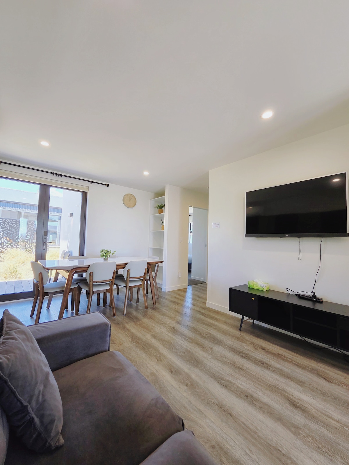 Enjoy stunning mountain and lake views from a new modern villa in Lake Tekapo. One of two villas situated within a large property, the house is private and peaceful. • Large windows and balcony to maximise the view of the mountains & stars • Fully equipped kitchen with gas stove • Oversized smart TV with Netflix & Neon • Onsite washer & dryer • Ample onsite parking • Plenty of green space - Three minute walk to cafes, restaurants, bars - Five minute walk to lake and church