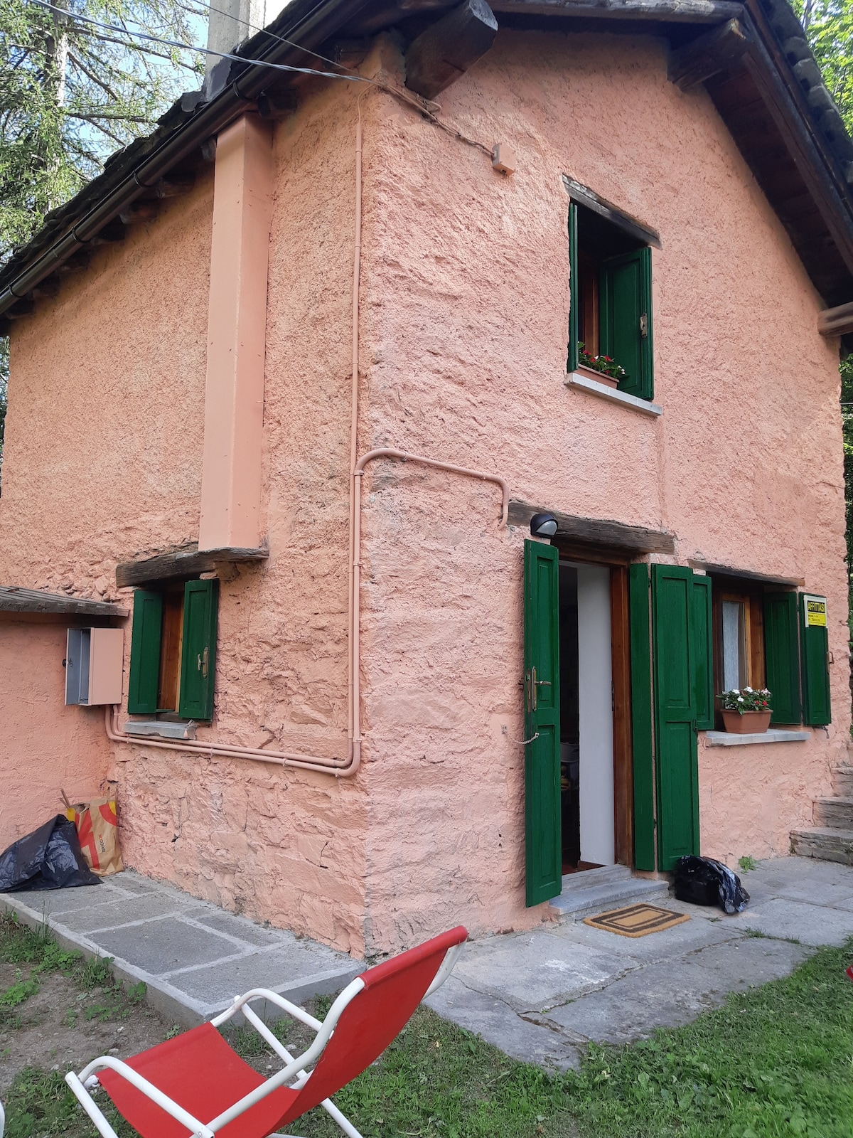 Mini casa nel bosco. Zona giorno al piano terra, zona notte e bagno al piano superiore collegate da scala interna Deliziosa, accogliente, per amanti della natura e della semplicità Cucina con induzione, stufa a pellet, lavatrice, wi-fi. No tv. Letto matrimoniale, e terzo letto di servizio Bagno con finestra e doccia. Giardino privato.