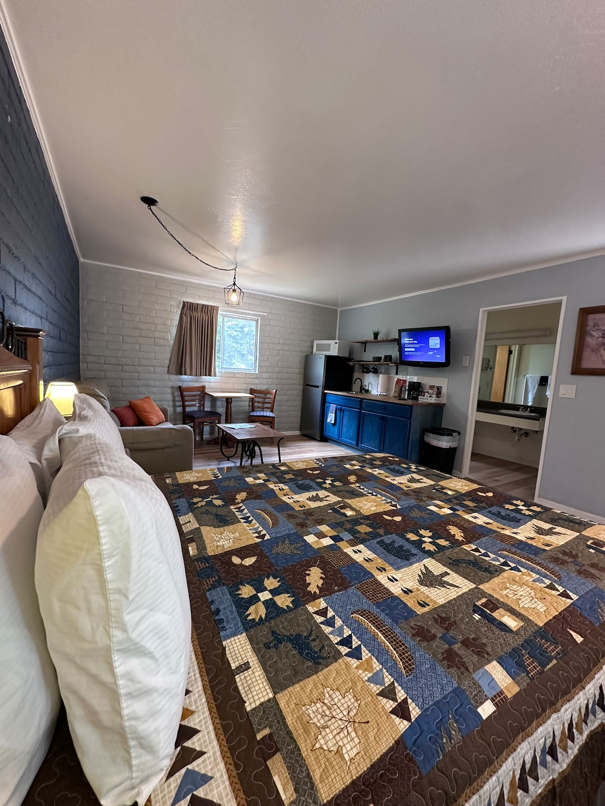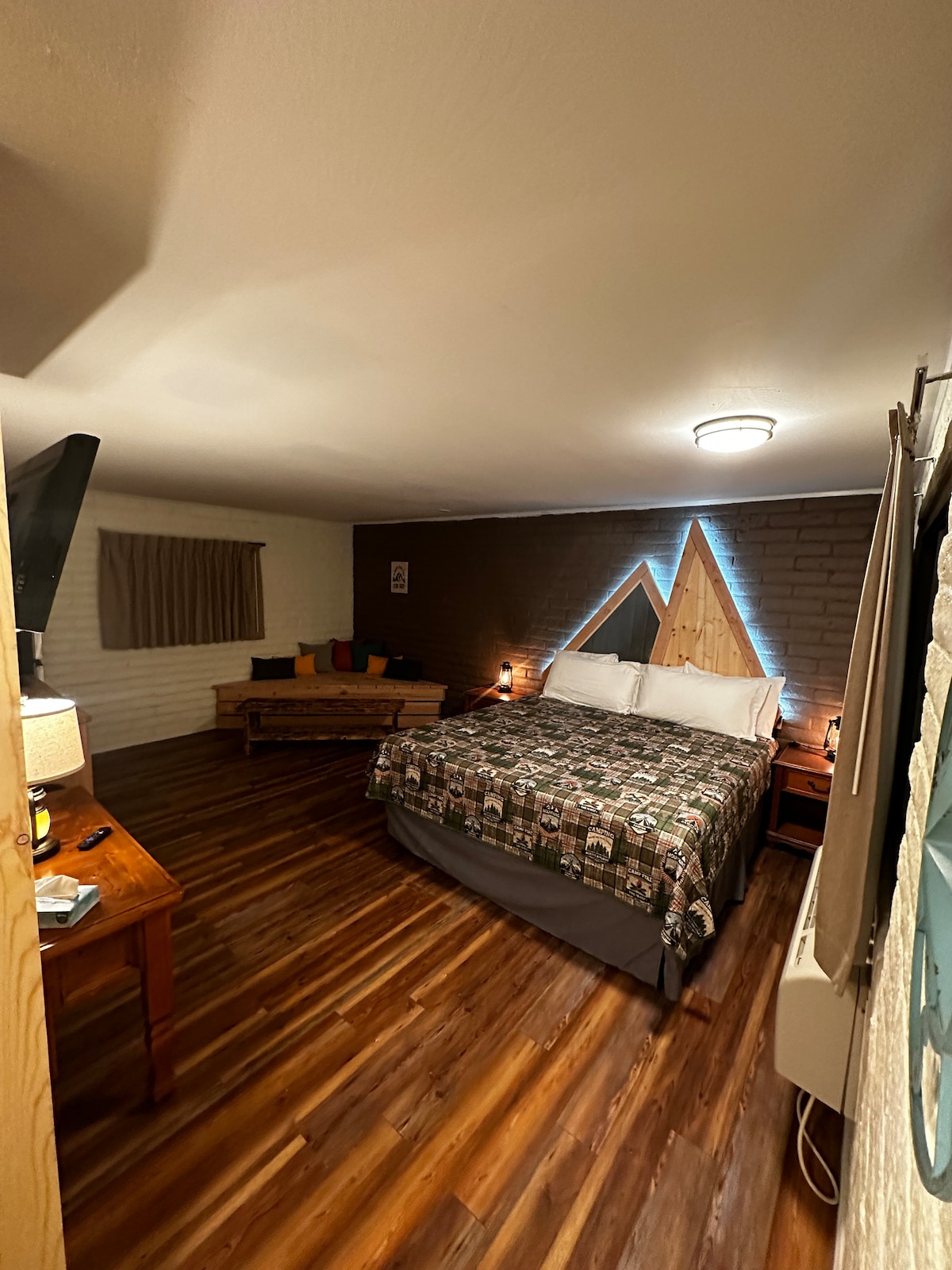 Wanderlust Retreat (Studio 206) king bed with a lighted mountain headboard, custom bench, kitchenette with fridge, microwave, coffeemaker, basic utensils & dishes. Wi-fi, Roku TV, A/C & heat, a hair dryer, and iron. *Please note that Studio 206 is NOT a pet-friendly room. (Check our first floor studios for availability of pet-friendly rooms) **Please also note there is no lobby or housekeeping. You will utilize a self-check-in process. Our onsite manager is available as needed.