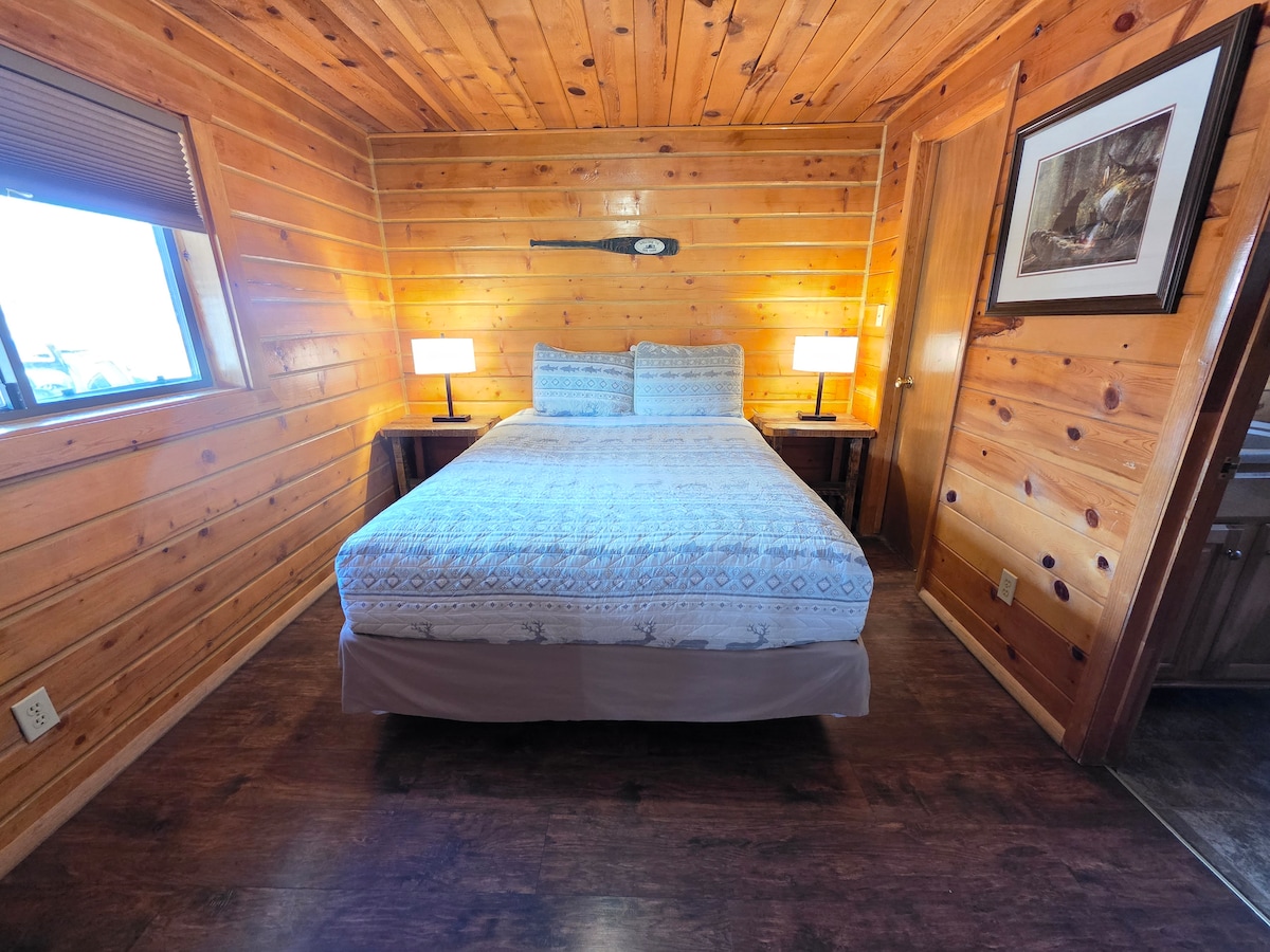 Shoreline Tiny home located on the channel of Rainbow Lake! This 600 sq. ft. 1 bedroom, 1 bathroom cabin has 1 queen bed and a futon couch bed. Perfect for a couple or small family. In the warmer months, launch a kayak right off the backyard into the channel and paddle around the beautiful lake! Afterward, wind down for happy hour and enjoy the gorgeous outdoors around a campfire on the shore, or enjoy the large wrap around patio with a gas firepit and ample seating.