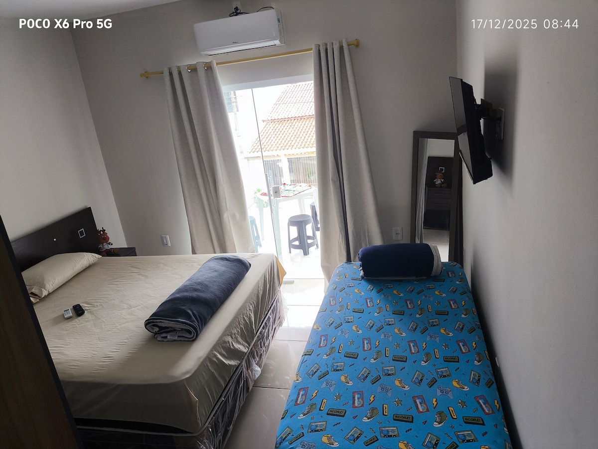 Hospede-se em uma casa de família! Suíte com banheiro privativo e equipada com uma cama de casal e uma bicama (quatro lugares no total), ar-condicionado, ventilador e guarda-roupa. Na área comum temos duas salas de estar e garagem. Localizada no centro, nossa casa está a 400m da rodoviária, 500m da feira de Aparecida, 800m da Basílica Velha e 1km do Santuário Nacional. Próximo a restaurantes, mercados, comércio e hospital. Minha família espera a sua!