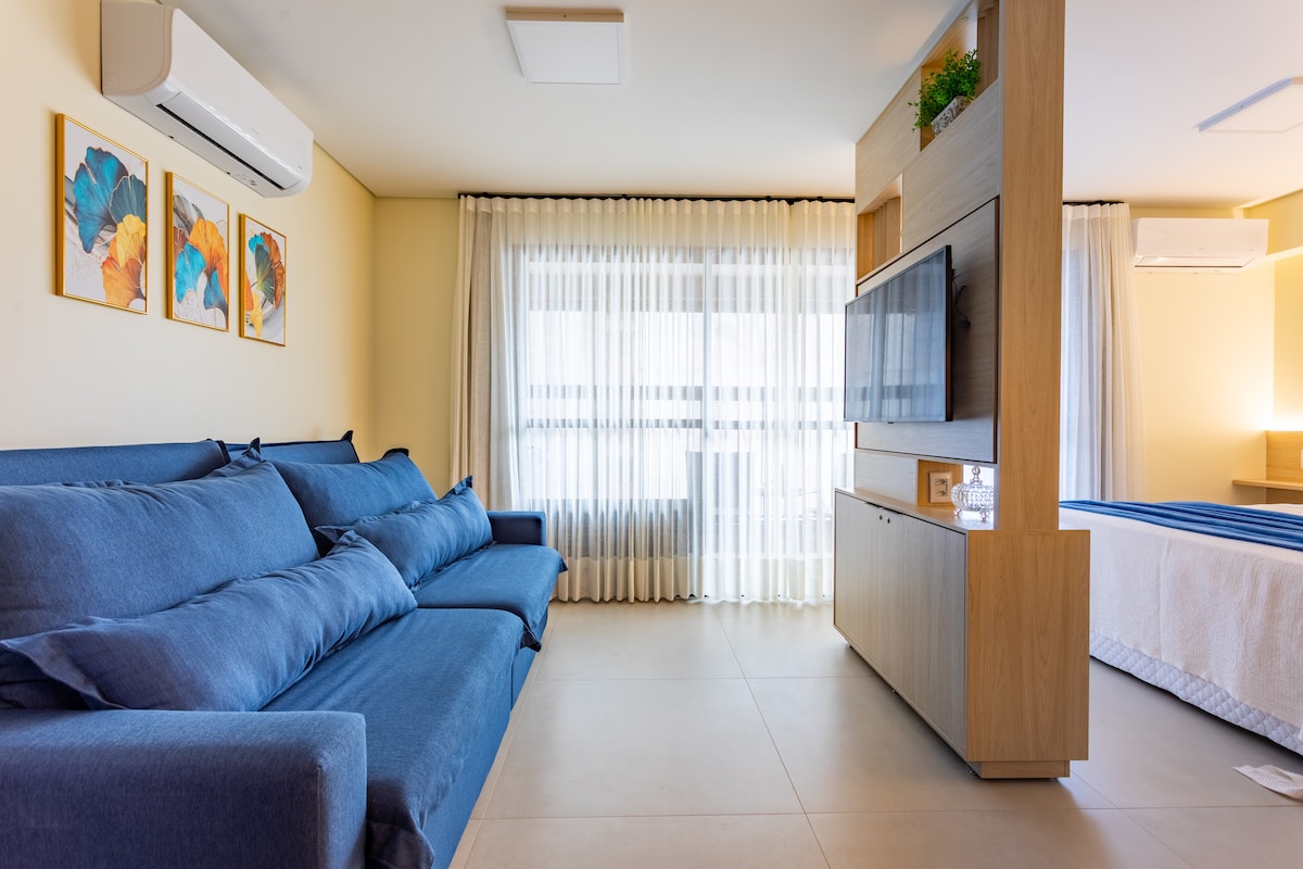 Lugar especial perto de tudo. Flat novo, muito bem decorado, com TV 55"(Netflix), ar condicionado, cama de casal queen, sofá cama de casal, roupas de cama e banho limpas e macias, máquina de lavar/secar roupas, geladeira, purificador refrigerado de água, cooktop, sacada com vista incrível, 1 vaga de garagem. Prédio é de alto padrão. Piscina borda infinita, vista panorâmica e aquecida, hidromassagens, academia e sauna na cobertura - 40 andar. Espaços temáticos, lavanderia, quadra squash, jardim.
