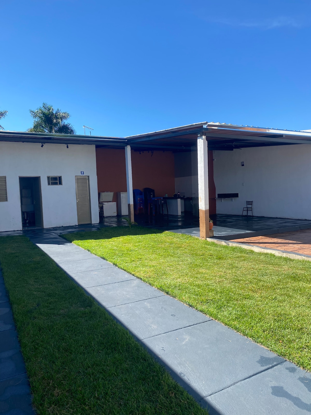 Esqueça de suas preocupações neste lugar espaçoso e tranquilo. Ideal para festejar momentos e compartilhar alegrias. O espaço conta com mesas e cadeiras para 64 pessoas, mas comporta até 100/120 ( as outras mesas e cadeiras podem ser alugadas). Temos 3 banheiros (1 masculino, 1 feminino e um família e acessível. No quiosque temos um local de guardar coisas, na cozinha temos fogão industrial e uma geladeira. Na área de churrasqueira um freezer horizontal. Piscina e uma área aberta.