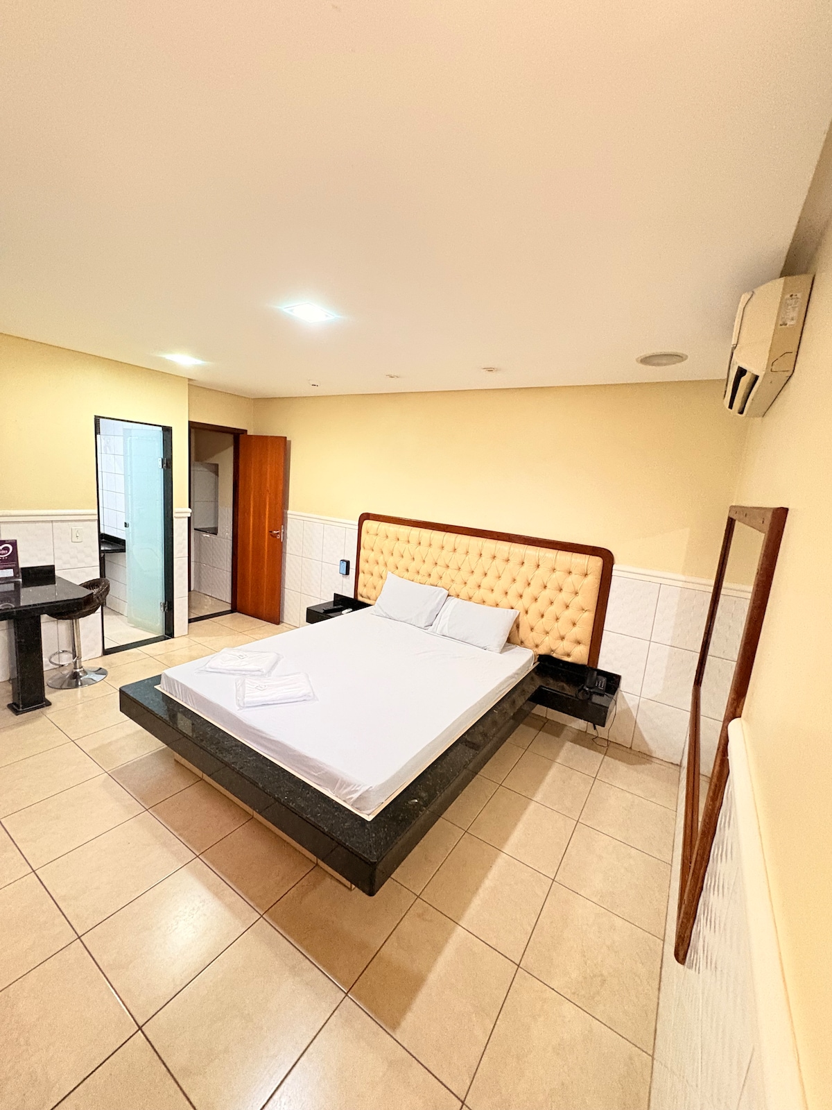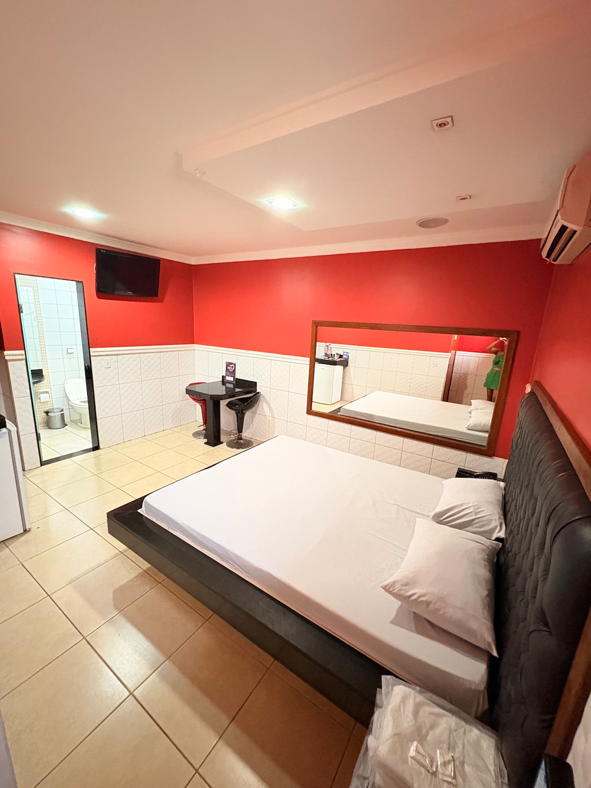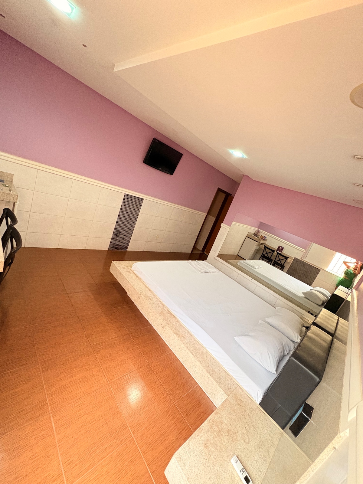 Suíte de MOTEL, com garagem privativa, Dispõe de cozinha com funcionamento 24 horas, com pratos e serviços cobrados separadamente. O espaço foi pensado para proporcionar uma experiência aconchegante, seja para uma noite especial ou uma curta estadia. O quarto conta com cama confortável, ambiente climatizado e decoração moderna, criando um clima agradável e reservado. Tudo é preparado com cuidado para garantir limpeza, conforto e bem-estar