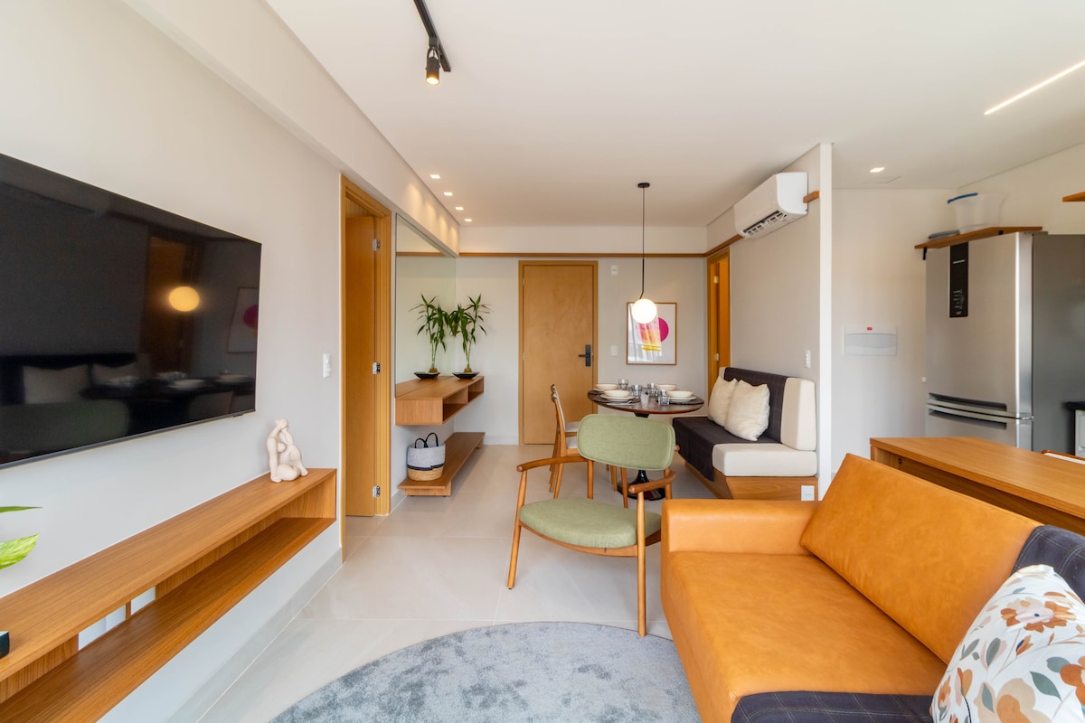 Viva a experiência de se hospedar com estilo, no moderno Ed. Hub Compact Life, no coração do Setor Bueno! Apartamento novo e sofisticado, 51m² de puro conforto, ar condicionado, varanda ampla com rede de proteção, cama Queen super confortável, sofá-cama premium. Wi-Fi rápida, SmartTV 50”, mesa de trabalho e lava/seca privativa. Relaxe no chuveiro incrível e aproveite a melhor região de Goiânia. Ideal para famílias, casais e viajantes que gostam de bom gosto. Reserve já e sinta-se em casa!