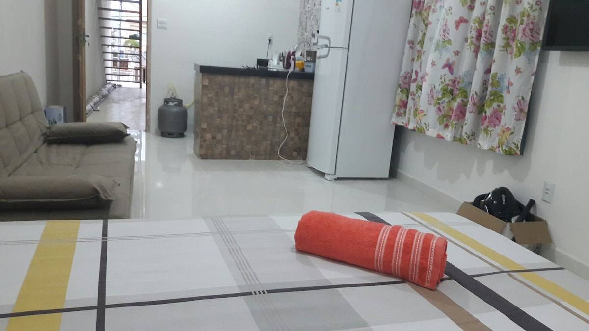 Studio apartment, banheiro novinho, cozinha novinha, dispõe de geladeira, microondas, cooktop, utensílios de cozinha, cafeteira, sanduicheira, conexão wi-fi, smartv com Netflix liberada, cama de casal(padrão colchões botafogo) e colchão solteiro extra("inflável" no caso de 3 hóspedes). Situado a 700m da orla da Praia Grande, e 250m do pontal do Atalaia, para desfrutar do mais famoso pôr do sol da região dos lagos, e ter acesso a uma das mais belas praias do mundo, As Prainhas!