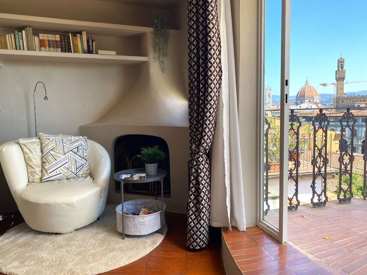Open the large glass doors to let the scent of Tuscan herbs in; step onto the terrace and uncork a Sangiovese wine to soak in the stunning views of the Duomo. Nestled on the roofs of the authentic Santa Croce and Sant'Ambrogio neighborhoods, this romantic rooftop flat features brand-new appliances, antique and handcrafted furniture, two bathrooms, and all the amenities you need for the perfect base to explore Firenze.
