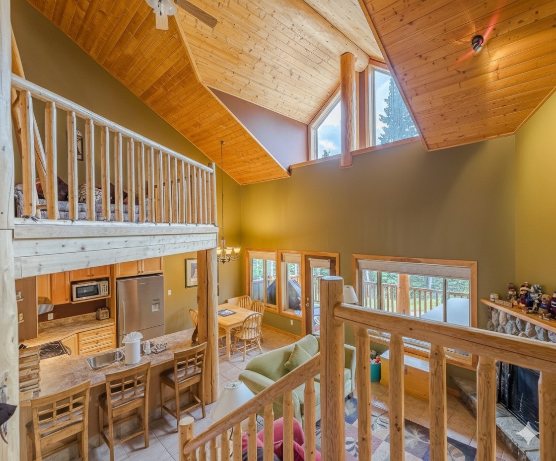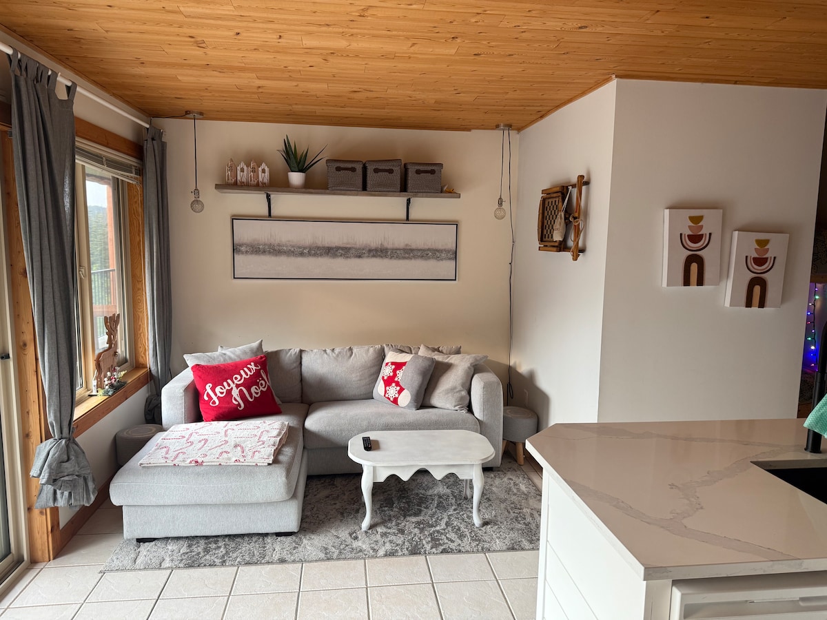 Relax with the whole family at this peaceful place to stay with a gas fireplace, hot tub and amazing views. This top floor unit is located only 5 minutes walk from the ski runs. This unit has one bedroom with a bunk bed on the main floor and one loft bedroom with the Queen bed and single bed. A fully equipped kitchen and dining room for family feasts.