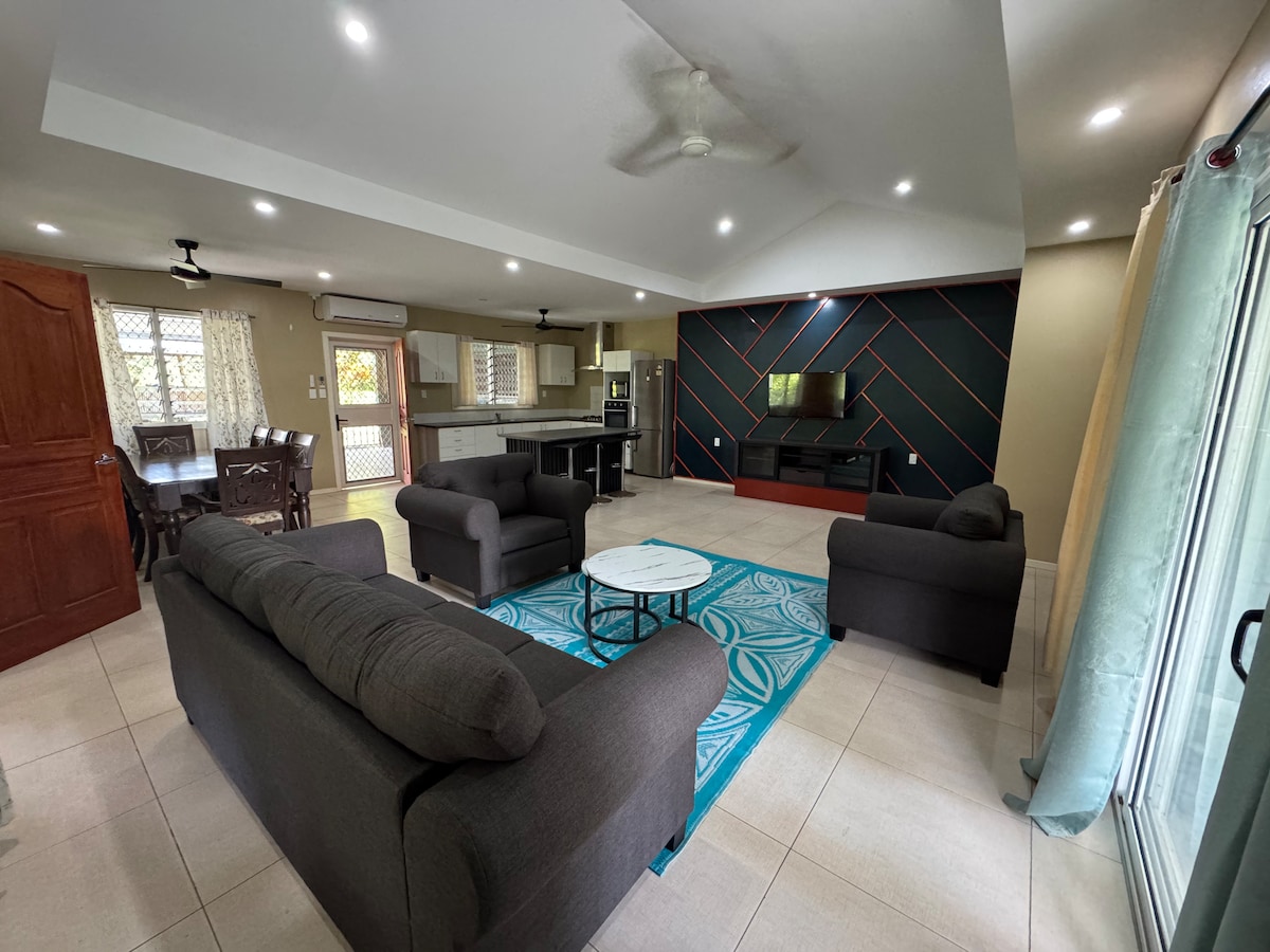 Experience the best of island living in this modern secure Villa, perfectly located between Apia and Vaitele. Combining comfort, style, and convenience, it's the ideal home base for families/friends/professionals. - 3 Bdr, 3.5 Bath - Open-plan w/polished concrete floors - Fully equipped kitchen with dishwasher - A/C & ceiling fans - Free Starlink WiFi & Smart TV - Purified drinking water - Washer & Dryer - Pool & undercover porch - 2-car carport w/electric gate - Standby generator & water tank