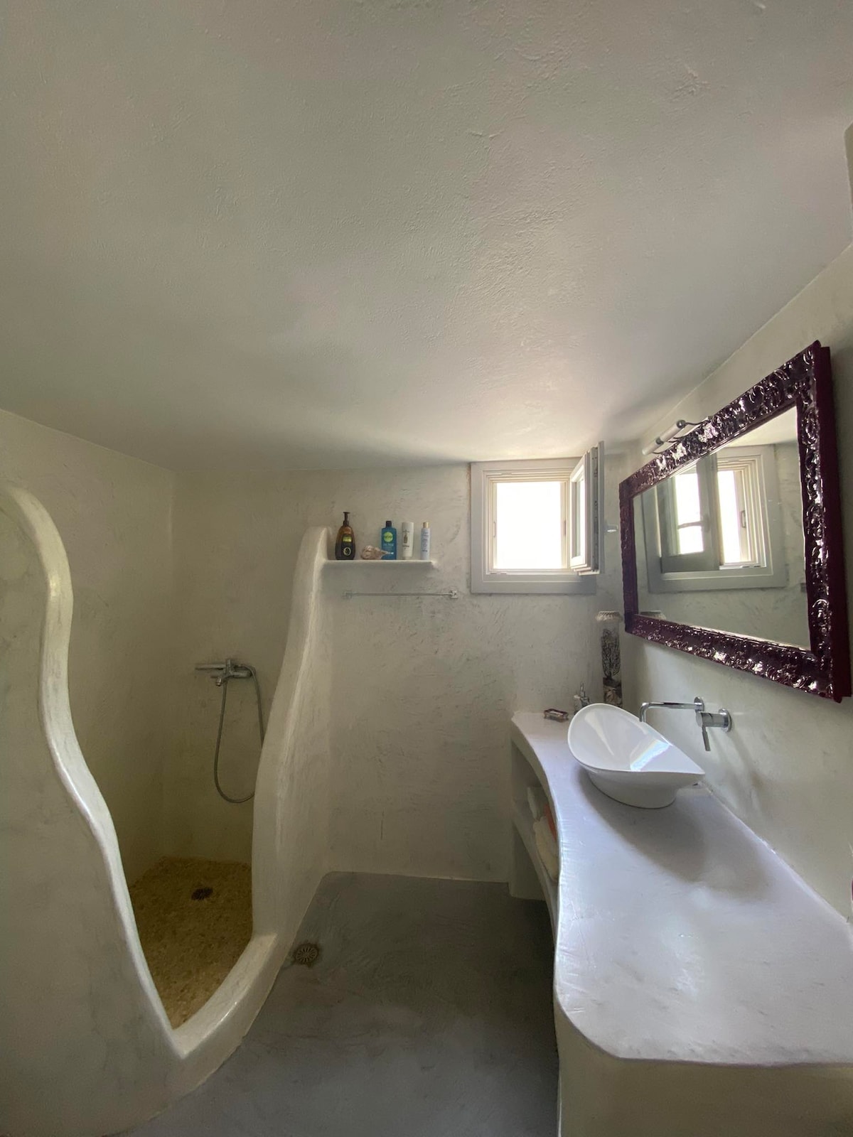 Bienvenue en Grèce, dans ma maison ! C’est une maison familiale, typiquement cycladique. Elle a appartenu à mes grand-parents et j’ai essayé d’en garder l’esprit, tout en l’adaptant aux exigences de la vie d’aujourd’hui . Une maison de village, accessible par un charmant escalier, elle est totalement protégée des bruits de la route. Exposée plein sud, (très important, car à l’abri du meltemi, vent du nord qui souffle en rafale tout l’été) , elle surplombe Klima, un pittoresque village de pêcheurs ( à 20mn à pied et 3mn en voiture) et toute la baie intérieure. Environnement très calme de grecs qui vivent là toute l’année et qu’il faut respecter. Des terrasses où prendre son petit déjeuner, et profiter des couchers du soleil incendiaires. A l’intérieur une première grande pièce commune, cuisine, salon avec un petit canapé, une salle de douche et WC, une belle chambre avec son « doulapi » (placard ) inclus dans le mur. Les plafonds sont restés traditionnels, poutres et kalami récemment blanchis à la chaux et dont la vertu est de protéger du bruit et de la chaleur, mais ni des moustiques, araignées et insectes qui peuvent nous rendre visite en dépit des soins constants apportés à la propreté de la maison ! Malgré tout, même si nous sommes tout près de la mer, nous sommes aussi dans la campagne grecque, celle des oliviers, des cyprès, et d’une flore typiquement cycladique; du chant des cigales et des grillons, la nuit tombée. Avec au loin, les clochettes des moutons et le braiment d’un âne. Ce qui rendra votre séjour dépaysant et je l'espère unique !