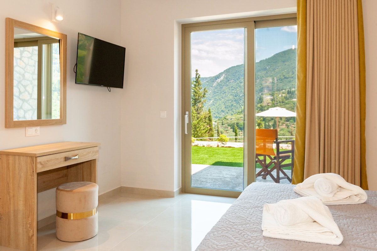Welcome to Apanema Mindfulness Resort in Lefkada. Open all year round & equipped with heating and cooling for all seasons, Peaceful Villa is a 50 sqm, ground-floor cosy detached modern stone villa. Private parking, a lovely terrace surrounded by trees, and a large garden area with green views. Ideal for couples but also for small families of 3,4 guests. On the premises, private access for our guests only: Pool, Free Sauna, Massage, Yoga, Pilates, Tai Chi classes and bike renting. Ultrafast WiFi.