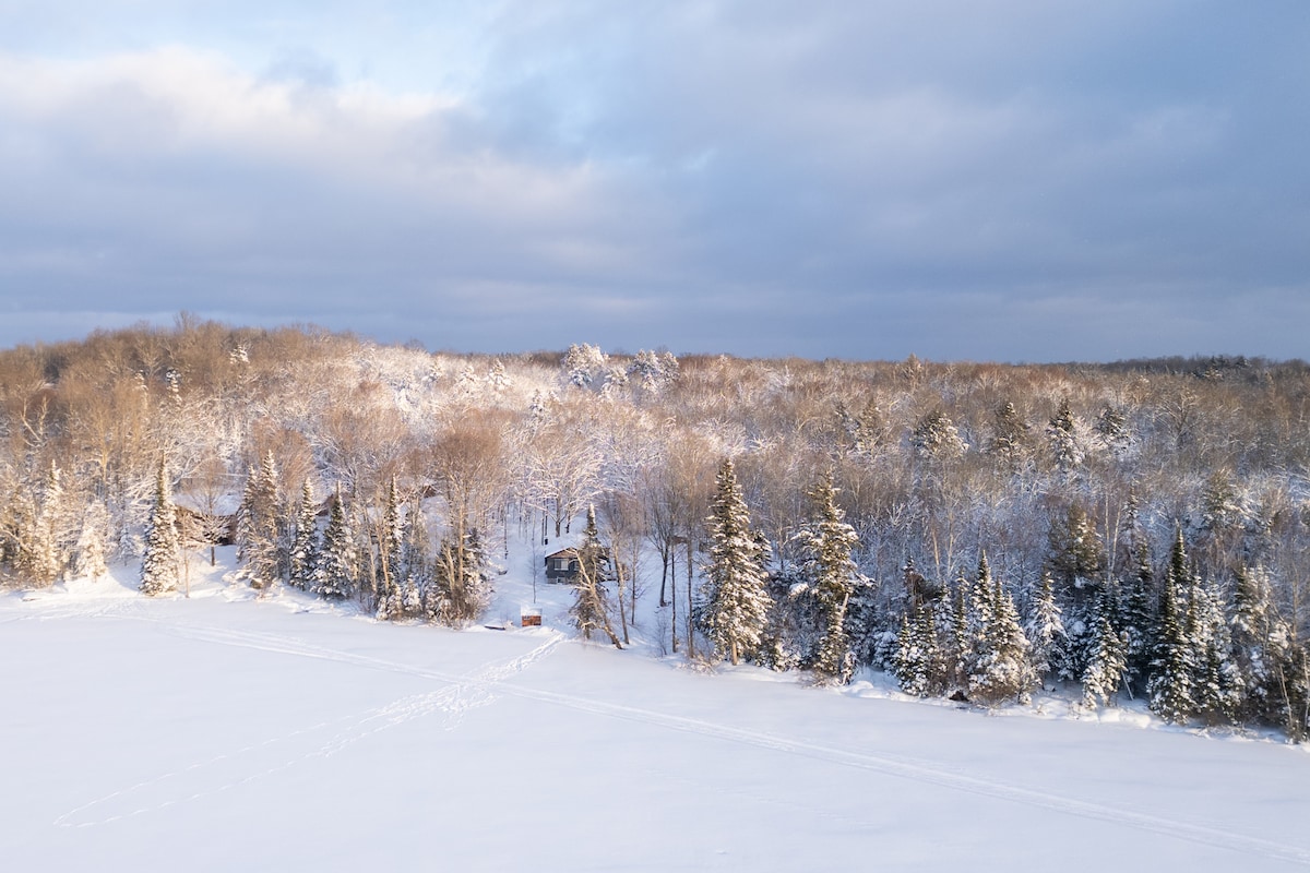 Rustic Elegance + Northwoods Flare + Island View Panorama + Fully Electric + Front Porch 10 minutes from Hayward, The Glamping Cabin's spacious semi-open floor-plan has 2 beds, full kitchen, dishes, utensils and a thoughtfully designed camp-style water system. Winter days are warm+cozy with the Row-0-Flames heater. Showers are outdoors when temperatures are above 32 degrees or next door at Loon Lake Guesthouse when its cold out. Your "toilet" is a colorful outdoor privy. Fully electric with WiFi