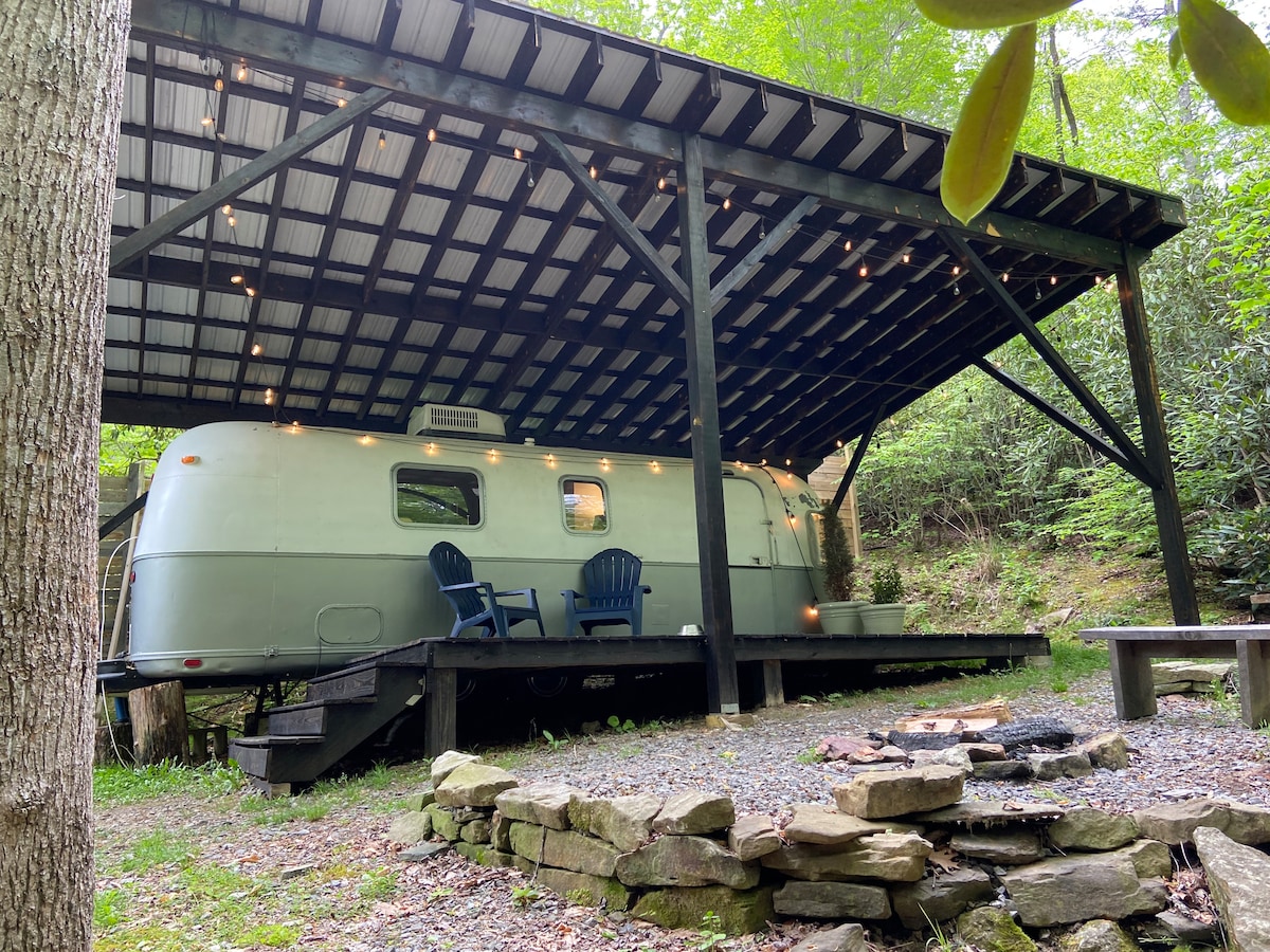 As its name suggests, The RhodoDen is a cozy 1974 Airstream Argosy nestled among the rhododendron of the Blue Ridge Mountains. Set along a trickling creek with a bonfire ring and a view of nearby Watch Knob, this is "glamping" at its finest. RhodoDen provides an idyllic place to relax, and is a great basecamp for hiking adventures, dining and nightlife in Asheville and Black Mountain, both of which are only 15 minutes away. Plus we are pet friendly! Update 3/24: We built a roof!
