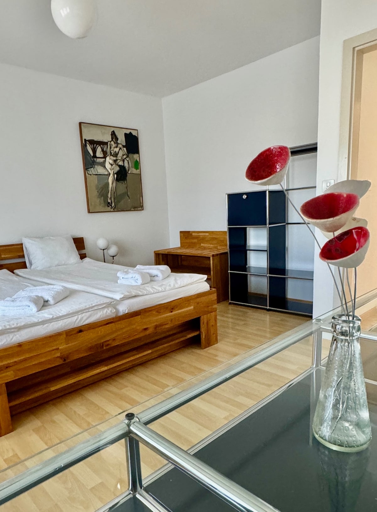 In our single-family home, we rent out our modern studio. The studio is located on the first floor, has its own private entrance, and is completely separate from our living area, except for the shared staircase. We place great value on sustainability – our home is heated with geothermal energy and we generate our electricity with a solar PVsystem. Experience the special feeling of starting your day with a clear conscience. Right next to the main entrance, there is a free parking space available.