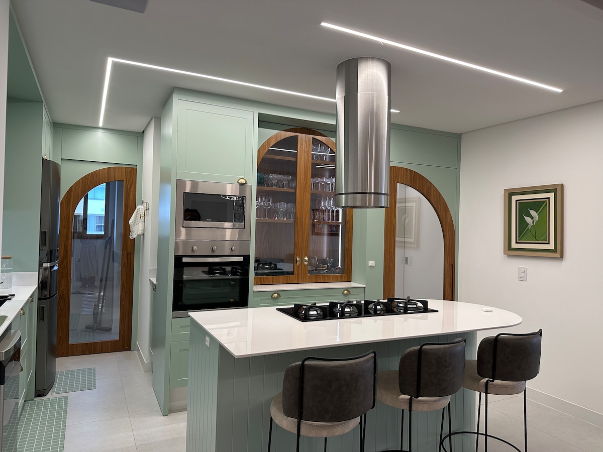 This sophisticated and spacious apartment can comfortably accommodate up to 2 people. Located near the beach and the center of Jurerê, it is perfect for those looking to explore the neighborhood with guaranteed convenience and mobility. Ideal for beach lovers who want to explore other charming spots in the region, after a day out, you can relax and have a barbecue with friends on the balcony, enjoying the air-conditioned spaces.