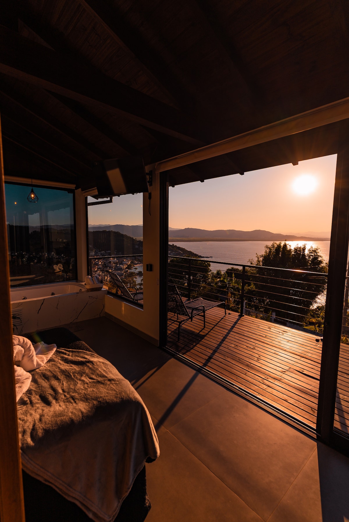 Lindo Studio no mais belo pôr de sol de Floripa. Moderno e aconchegante, o espaço oferece cama Queen size e sofá cama, roupas de cama de qualidade, toalhas, cozinha completa, wi-fi rápido, Smart TV, garagem privativa, fechadura eletrônica para sua segurança, piscina com borda infinita, a 200 metros da praia de Santo Antônio de Lisboa. Ótima localização, perto de toda infraestrura necessária e restaurantes. Ideal para casais, viajantes a trabalho ou turistas que buscam conforto e boa localização.