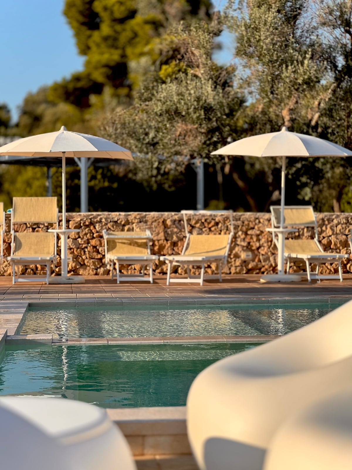 Il trullo è immerso in più di ottomila metri di terreno delimitato dai classici muretti a secco. Ulivi, querce e macchia mediterranea riempiono la vista anche dall’interno della piscina. È il luogo ideale dove rigenerarsi, riposarsi e guardare le stelle . È la nostra casa estiva, ma ogni tanto la affittiamo. Si trova nella magica Valle d’Itria: Locorotondo, Cisternino e Martinafranca sono a dieci minuti. Con qualcuno in più si raggiungere il mare di Savelletri, Capitolo e Torre Guaceto.