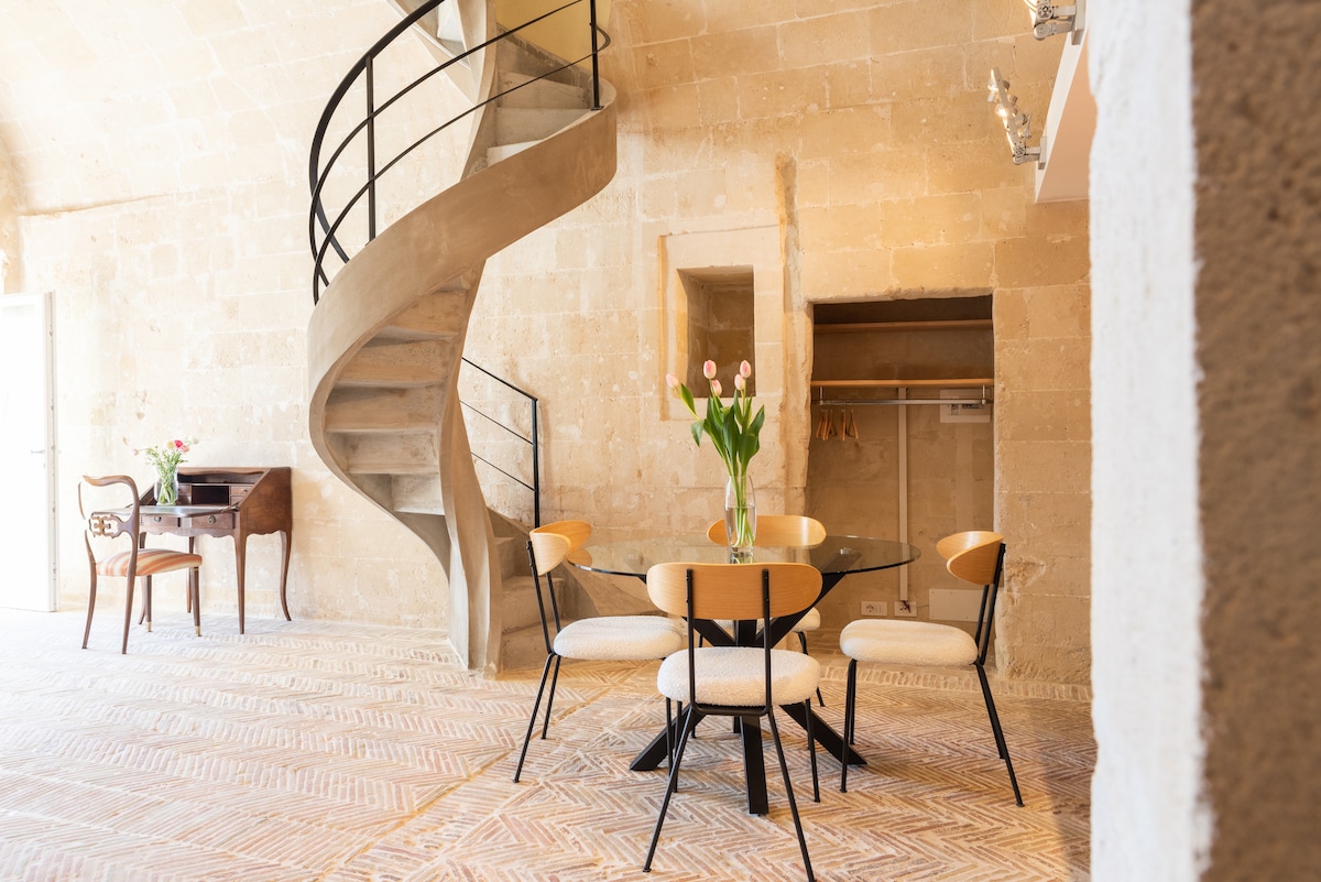 Suite Santa Maria - L'Opera dell'Architetto is a wonderful suite located in the heart of the Sassi of Matera, just a few steps from the striking 13th-century Romanesque-Pugliese-style Cathedral. Nestled in an ancient palazzotto in the Civita of this beautiful town, our home offers a patio with enchanting views of both the Gravina stream and the impressive canyon where the Park of the Rock Churches is located.