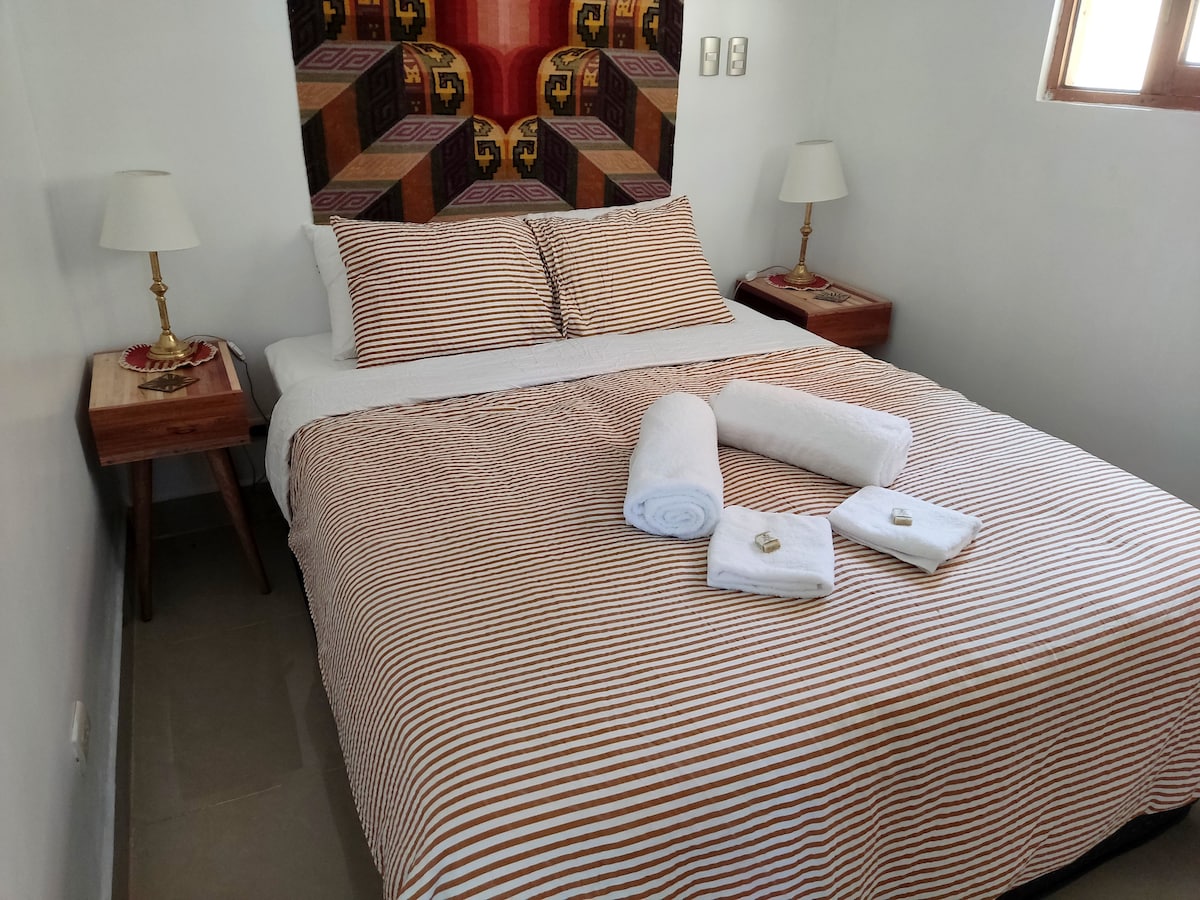 Pequeño departamento en medio de una huerta de frutas y flores; con todo lo necesario para una estancia cómoda. Área total: 45 m2, piso y medio de construcción. Primer Piso: sala, cocina y baño (agua caliente en la ducha con terma a gas). Segundo piso: habitación y un balcón con vista a las montañas. Acabados en arcilla, piedra, madera y cerámicos. Ventanas amplias, así como un tragaluz en el techo proveen de luz natural durante todo el día. Pd. Se puede recoger a los huespedes desde Cusco (aeropuerto u hotel) en nuestra movilidad y llevarlos a la casa en Urubamba por una tarifa adicional. Consultar