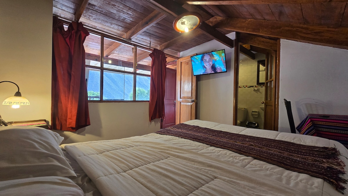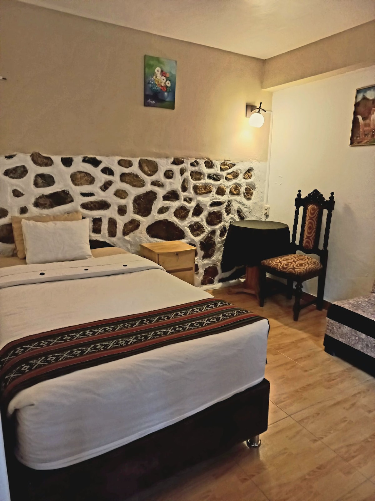 Vive la magia del Valle Sagrado desde esta acogedora habitación con diseño rústico y detalles andinos. Estamos ubicados a solo 5 minutos caminando del complejo arqueológico de Ollantaytambo y a 10 de la estación de tren a Machu Picchu. Disfruta de: - Cama queen size y ambiente silencioso - Baño privado con agua caliente 24/7 - Wifi rápido y escritorio - Estacionamiento gratuito Ideal para parejas, viajeros solos o amantes de la historia que buscan tranquilidad y conexión con la cultura local.