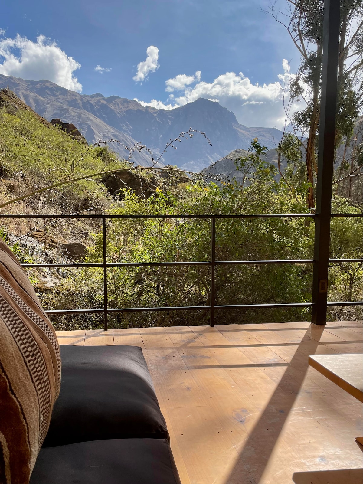 This King Suite blends comfort and style with a cozy work area, a spacious bathroom, and floor-to-ceiling sliding doors that open onto a patio with breathtaking mountain views and direct access to our open-air platform. Guests enjoy the intimacy of a boutique setting—perfect for relaxing after exploring Ollantaytambo, Machu Picchu, and beyond—while embracing serene views and a deep connection to nature.