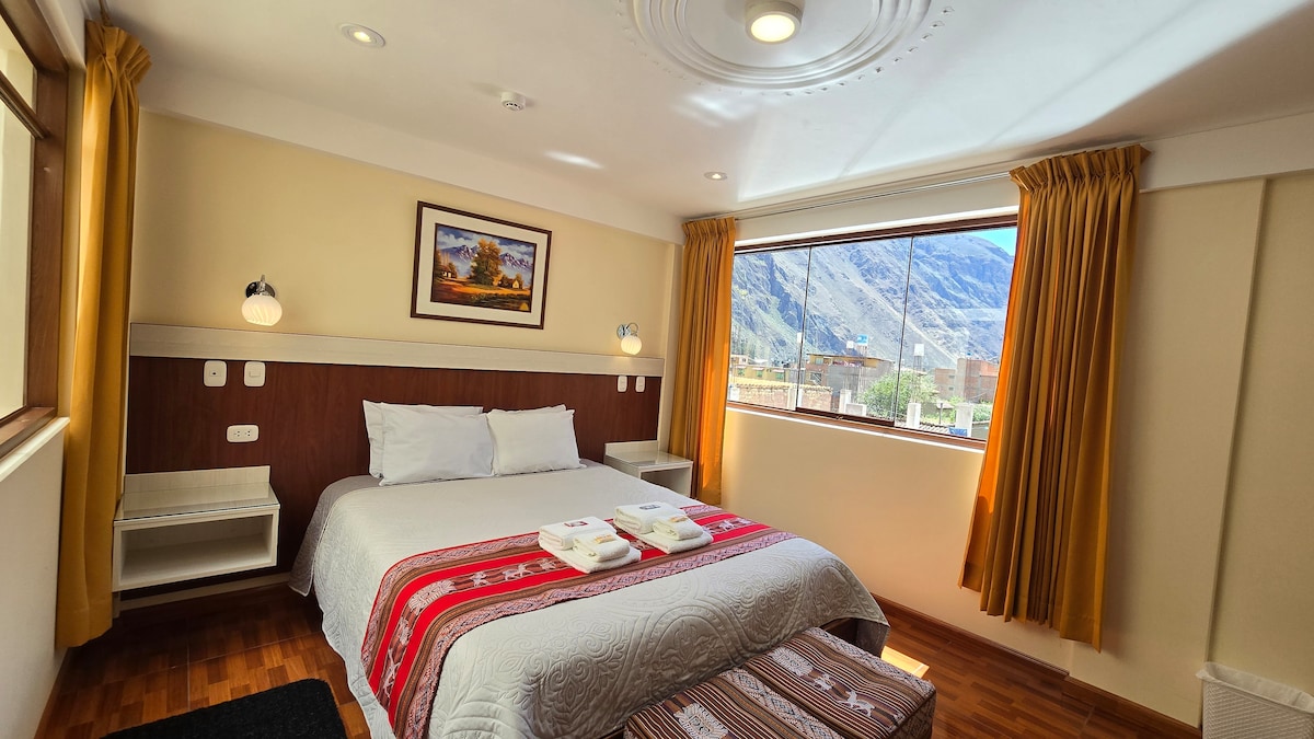 Quiet and well-located hotel in Ollantaytambo, just a few minutes from the Main Square and very close to the train station, with vehicle access right to the door. The interior, peaceful room with a double bed (1.35 m), private bathroom, and 24/7 hot water. Wi-Fi, cable TV, heater, and kettle, towels, shampoo, and soap. We offer a beautiful terrace with great views, shared kitchen/dining area for guest use. Breakfast included (box breakfast available for early departures). Ideal for 1–2 guests.