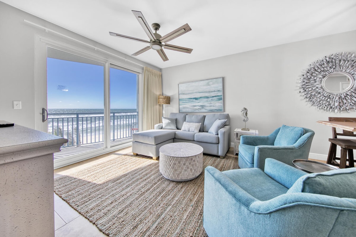 Highlights You’ll Love: • Direct Gulf-front condo with sweeping shoreline views • Oversized private balcony for dining and lounging • Free beach chair service included (2 loungers + umbrella, March–October) • Sleeps 6: two king bedrooms plus twin bunk alcove • Two full bathrooms for comfort and privacy • Smart TVs in all rooms + large Smart TV in the living room • Fully stocked kitchen with coffee/tea bar and generous supplies • In-unit washer/dryer with starter laundry items • Resort amenities: