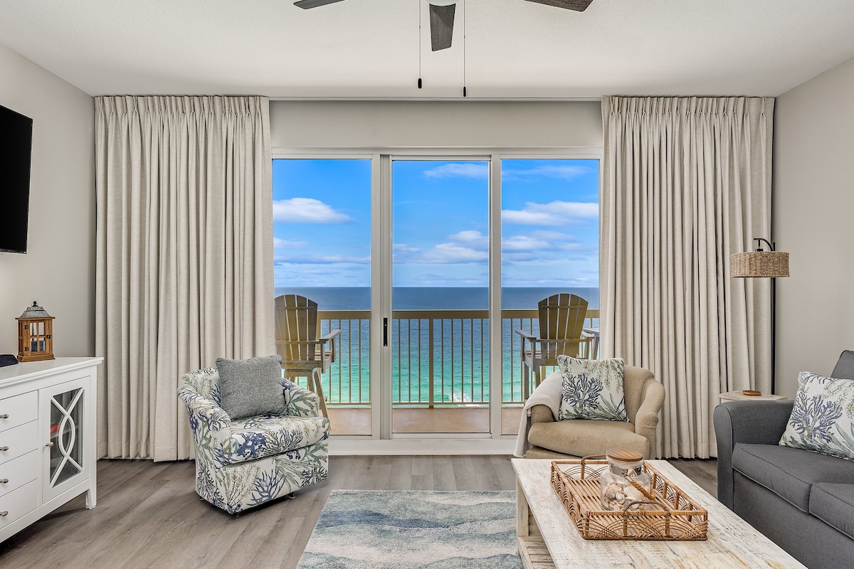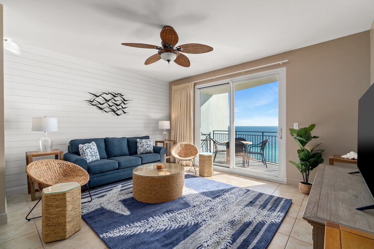Oceanfront condo with panoramic Gulf views from the terrace, primary bedroom, and living room. Sleeps 6. 2BR + bonus room with 2 twins (no closet), 2BA. Kitchen remodel Jan 2025 (pics soon). 2024 guest bath with double sinks, 2022 primary spa bath with tiled walk-in shower. 10-min walk to Pier Park. HE washer/dryer, private WiFi, 70" Smart TV with Hulu, Smart TVs in all bedrooms. Must be 25+; ID may be required. ** Not seeing dates that work for you? Check out airbnb.com/h/nautical-nonsense9