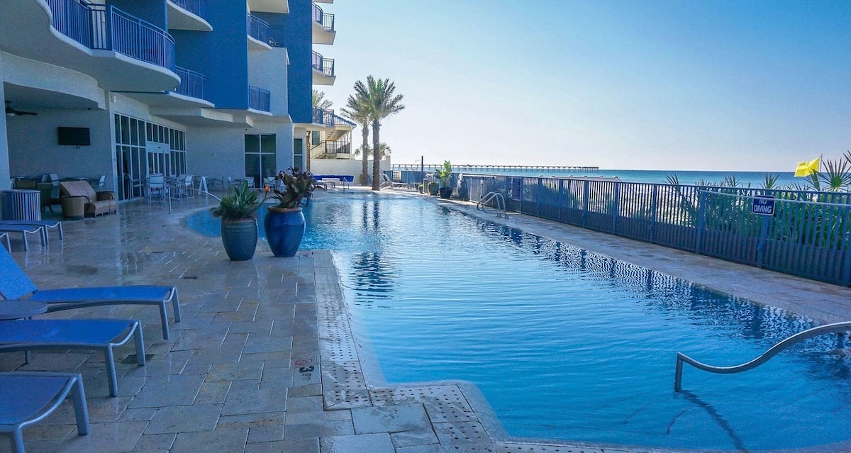 Beachfront. Fully furnished with a spacious floor plan, 9ft ceilings, granite countertops, breakfast bar, large balcony off living room with private grill, dining table/chairs with impressive views of the Gulf of Mexico. First-class amenities include: Fitness Center, Poolside Drink & Snack Bar, 2000 sq.ft Heated, Infinity Edge, Gulf front pool, Whirlpool Spa and Natural Stone Fire Pit. Secure, covered parking. Located 1/2 mile from Pier Park shops, restaurants and Russell Fields Pier.