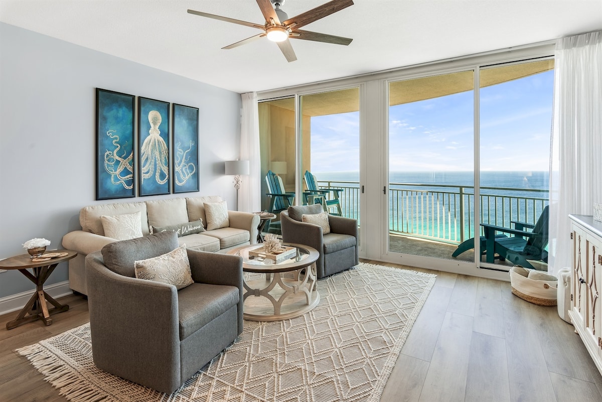 This 270-degree Observatory corner condo on the 25th floor offers breathtaking coastal beache views for miles. Located in the tallest building in PCB, Tidewater Beach Resort, this unique unit allows you to enjoy beautiful sunsets from right from the living room sofa or dinner table. At night, you'll be treated to the dazzling city lights on one side and the enchanting starlight and moonlight over the ocean on the other. The resort boasts several pools, a free spa, a gym, and private beach access