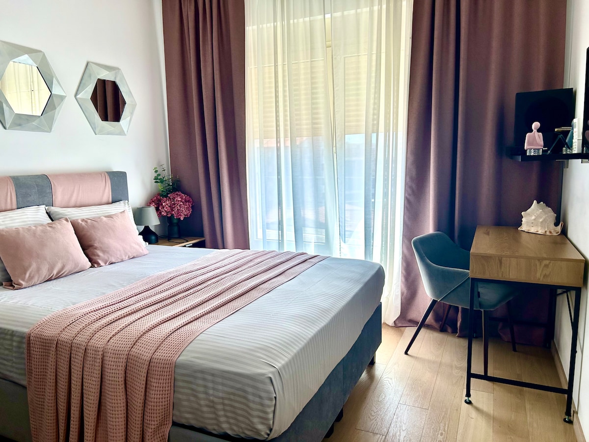 Fully furnished with modern interiors brand new apartment in the hearth of Budva! Within walking distance of day & nightlife options. Exclusive restaurants, cafes, supermarkets, night clubs, 4-minutes walking distance from waterfront promenade/beach. In the middle of all actions but just far enough where it won't affect your SLEEP. Enjoy beautiful views of the sea and the city of Budva from the private balcony. THIS IS THE PLACE TO STAY.