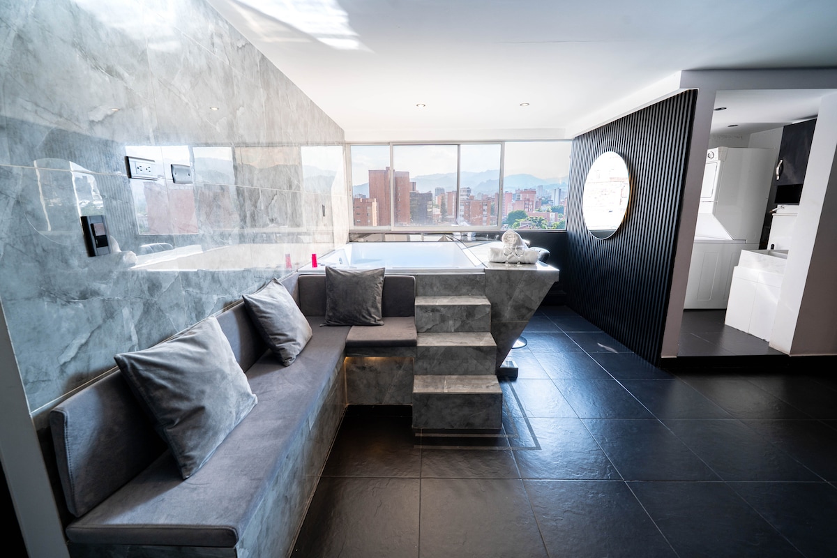Book a stylish experience at this exclusive open plan studio near parque Lleras! - INCLUDED WITH THIS SPACE - - Dedicated work space with high speed WiFi - Private jacuzzi - Air Conditioning - Free on-site parking - 54" rotating smart TV - Netflix - King-sized hotel quality bed - Free on-site washer/dryer - Fully functional kitchen - Tea/coffee station - Black-out curtains - Body soap, shampoo & conditioner - Gym - Sauna - Swimming pool - On-site bars, restaurants & cafeteria - Art gallery