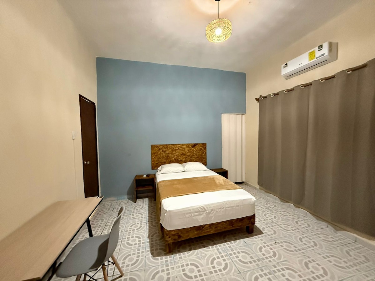Limpieza profunda antes de cada reservación y desinfectada con producto certificado por COFEPRIS. Espacio cálido y hogareño, con servicios para permanecer estancias largas y sentirte como en casa. Cuenta con una cama king size, pantalla de 42 ", baño propio, aire acondicionado, closet, cocina equipada con cafetera, parrilla eléctrica, refrigerador, vajilla, microondas y plancha. NO CONTAMOS CON ESTACIONAMIENTO