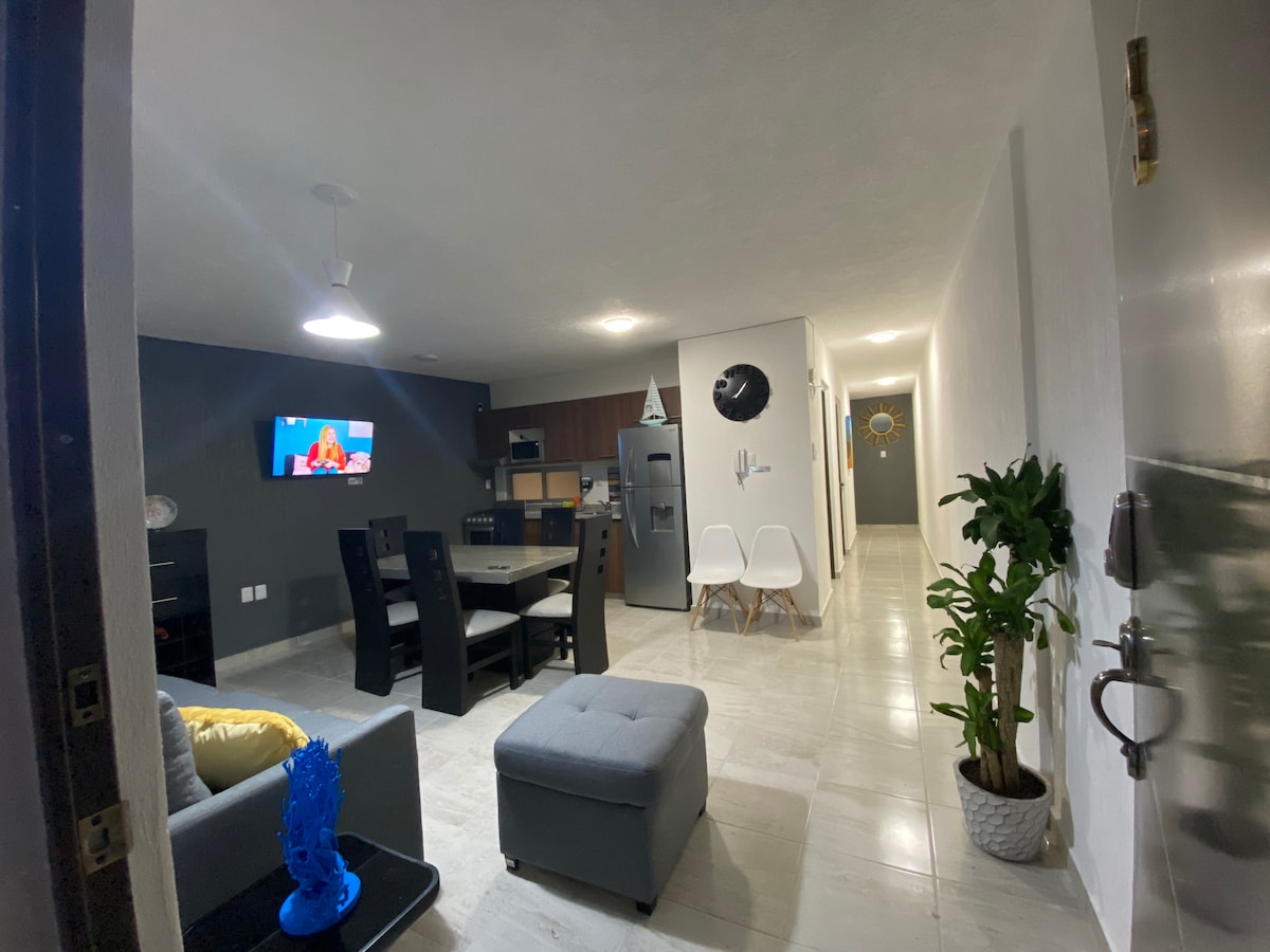 Vive la experiencia de viajar y sentirte en casa, contamos con todo para que tu estancia sea placentera, confortante y amena. Tenemos todo cerca, a 1 minuto del de la playa, 20 minutos del aeropuerto, designamos espacios seguros para tu estancia Comfort dentro de un edificio con acceso controlado, privado y sumamente seguro. Dos cajones de estacionamiento. 3 recamaras. Pet Friendly (mascotas). El departamento NO incluye la disponibilidad de la Alberca.